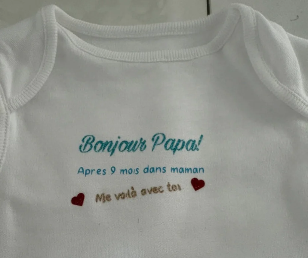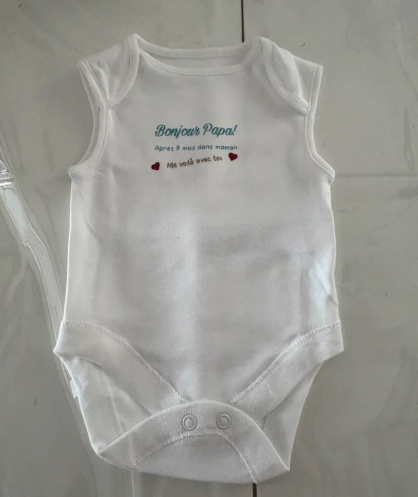 Adorable body bébé blanc taille naissance avec le message : “Bonjour Papa ! Après 9 mois dans maman Me voilà avec toi.” Parfait comme premier body pour la naissance, souvent celui que le papa met à bébé à la maternité 🥰 Idéal aussi pour une jolie photo souvenir des premiers moments. • Taille : naissance • Couleur : blanc • Pressions à l’entrejambe • Très bon état Body doux et confortable pour les premiers jours de bébé. #amandine181295bébé