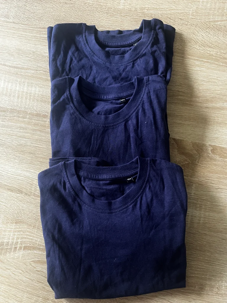 Quantité : 3 t-shirts identiques. • Taille : 10 ans • Matière : 100% Coton • Couleur : Bleu marine uni. #tshirtfille #tshirtgarcon #lot10ans #basique #bleumarine #100coton #ecole #lotvetements #taille10ans #tshirtuni