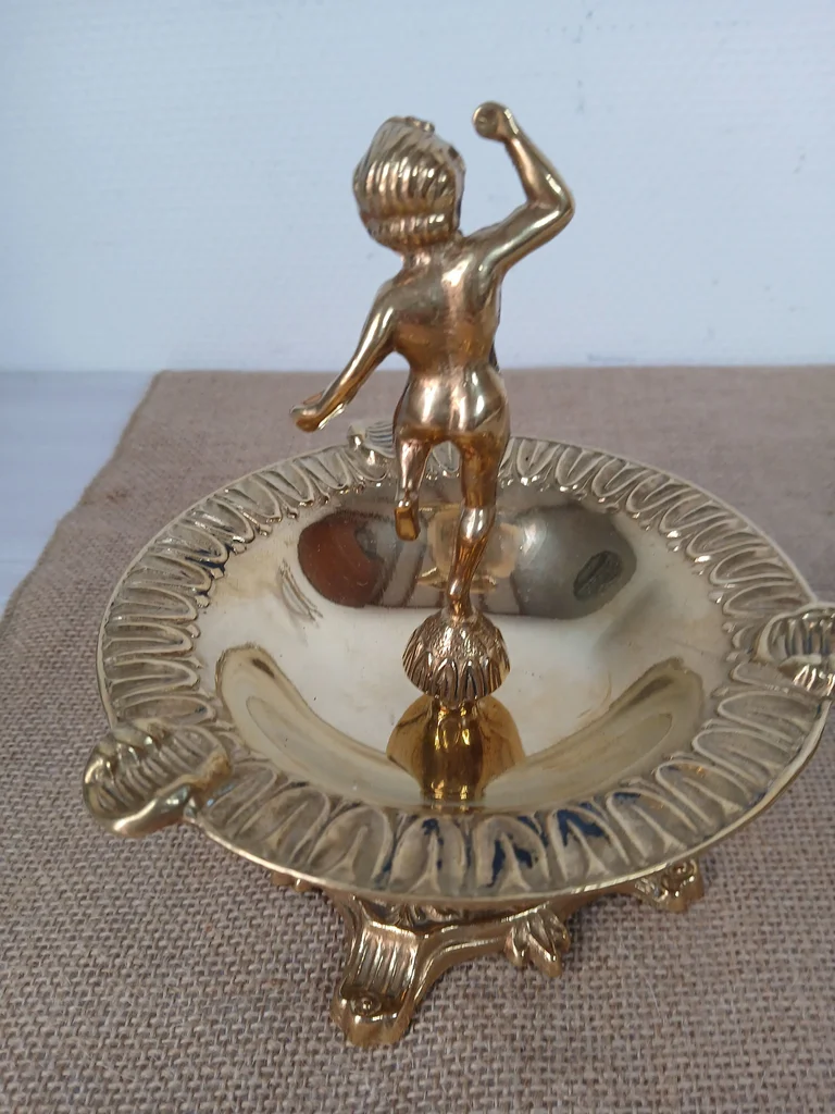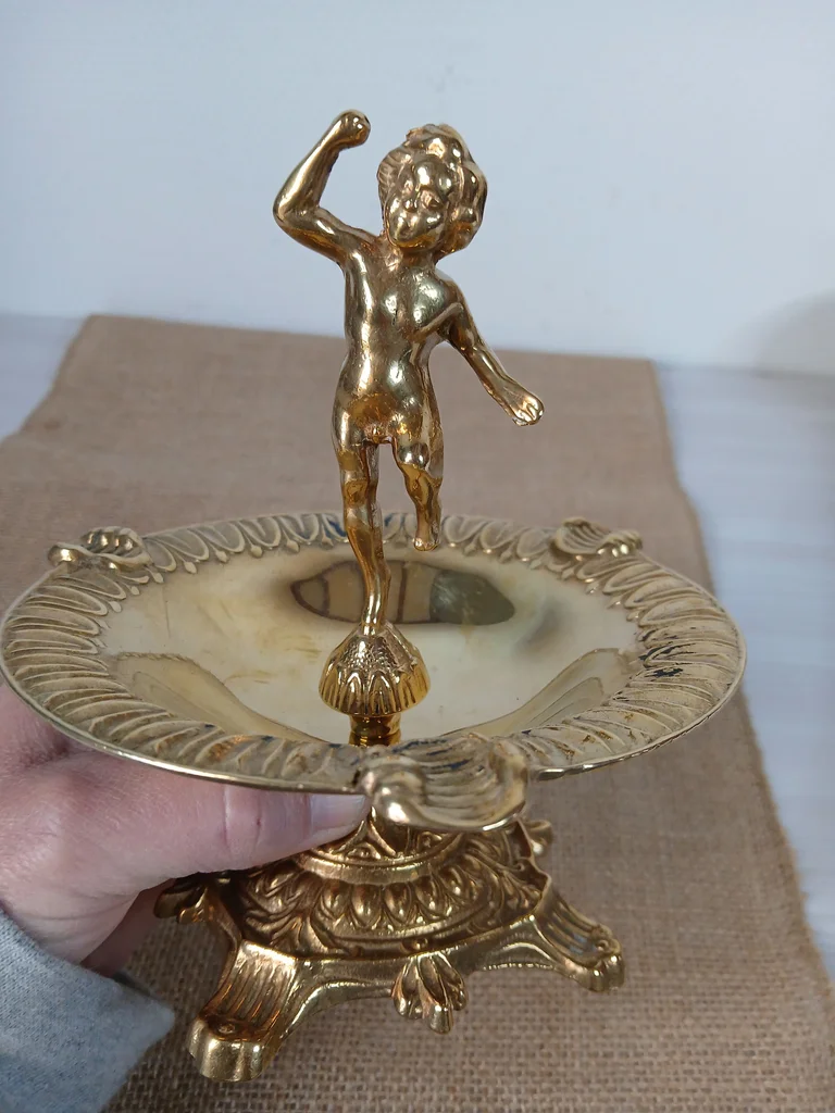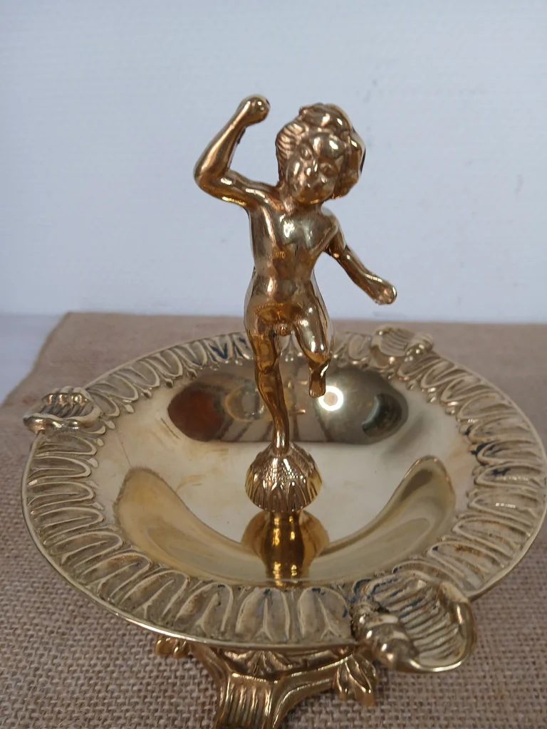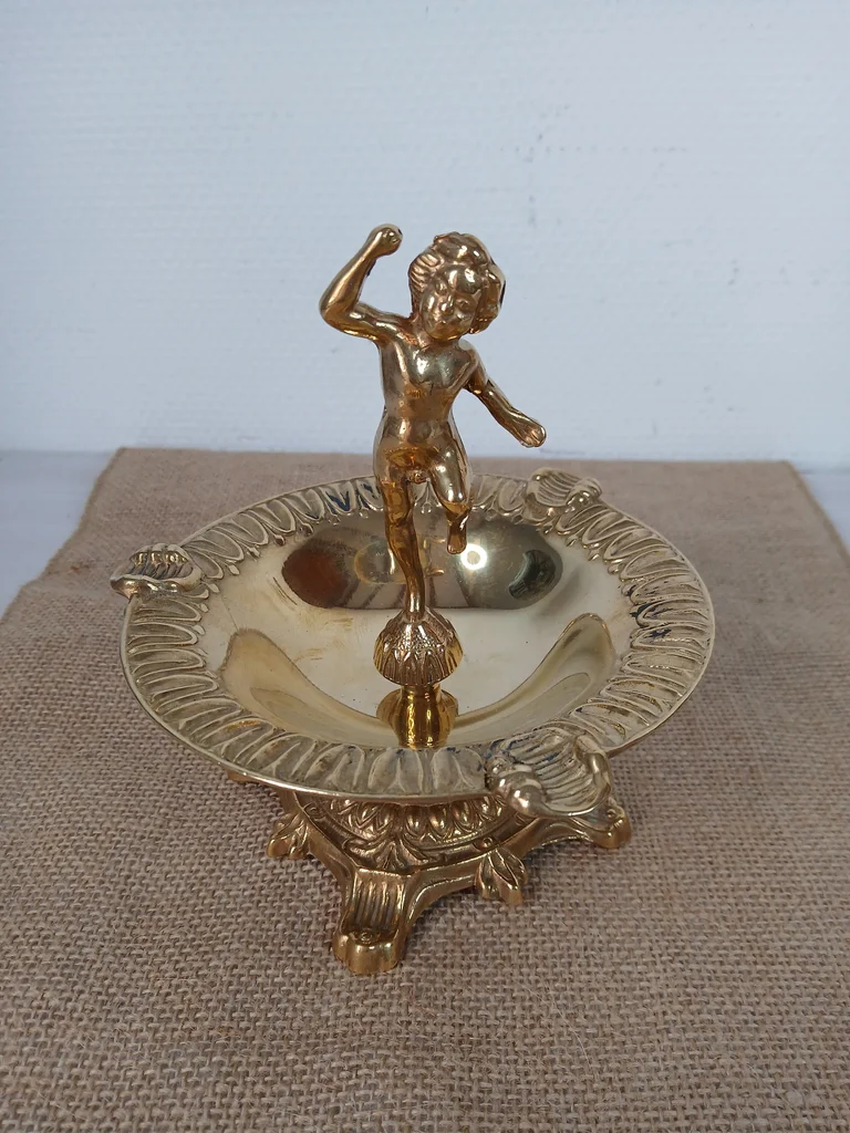 Jolie cendrier chérubin En laiton style bronze doré De 16 cm hauteur De 15.5 cm Diamètre Poids 630 gr Ancien en bon état Usure du temp Petit défaut usure ( petit trou )