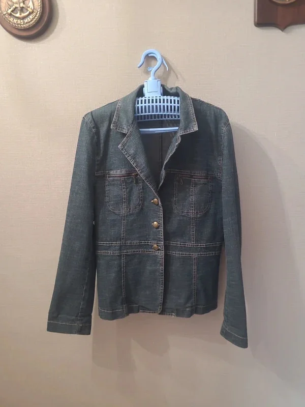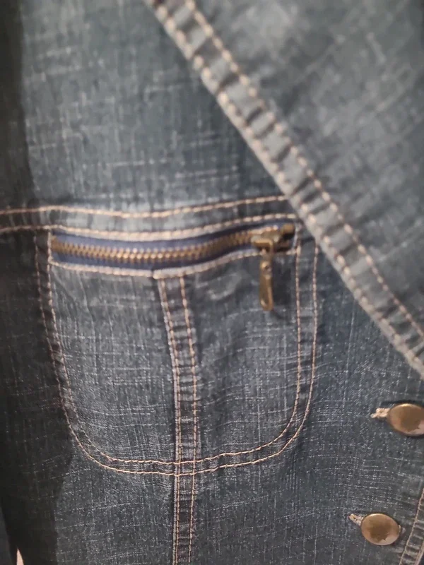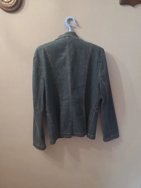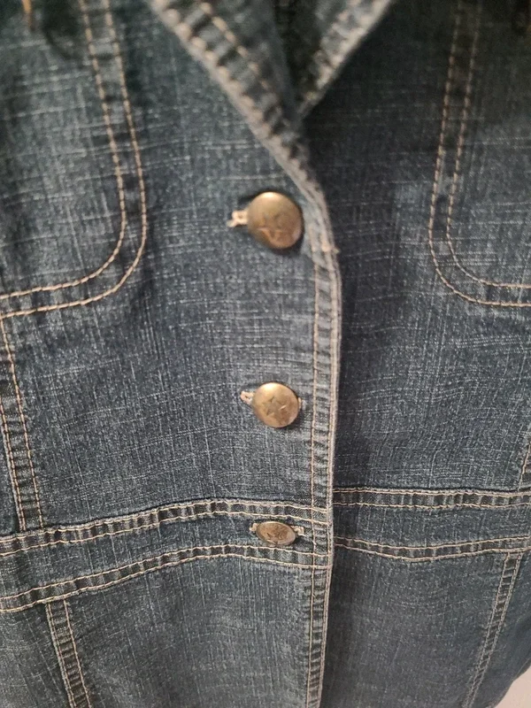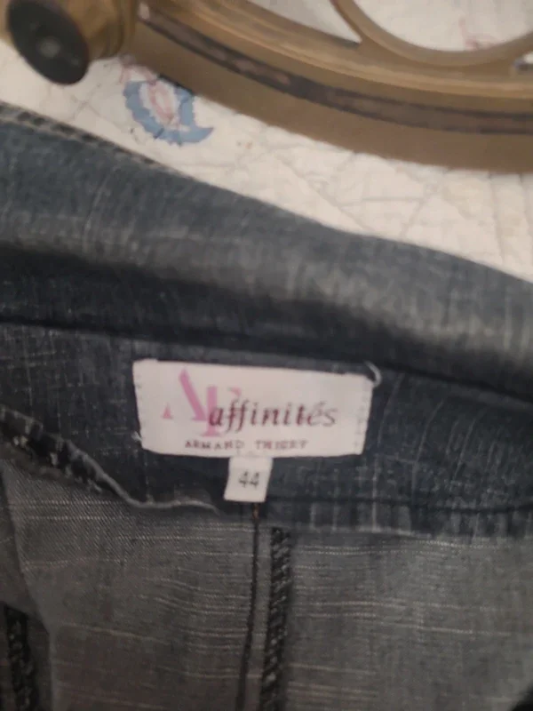 Veste jeans Taille 44 3 boutons 2 poches poitrine En parfait état comme neuf Aisselle à aisselle 50 cm Epaule à épaule 40 cm Hauteur 63cm
