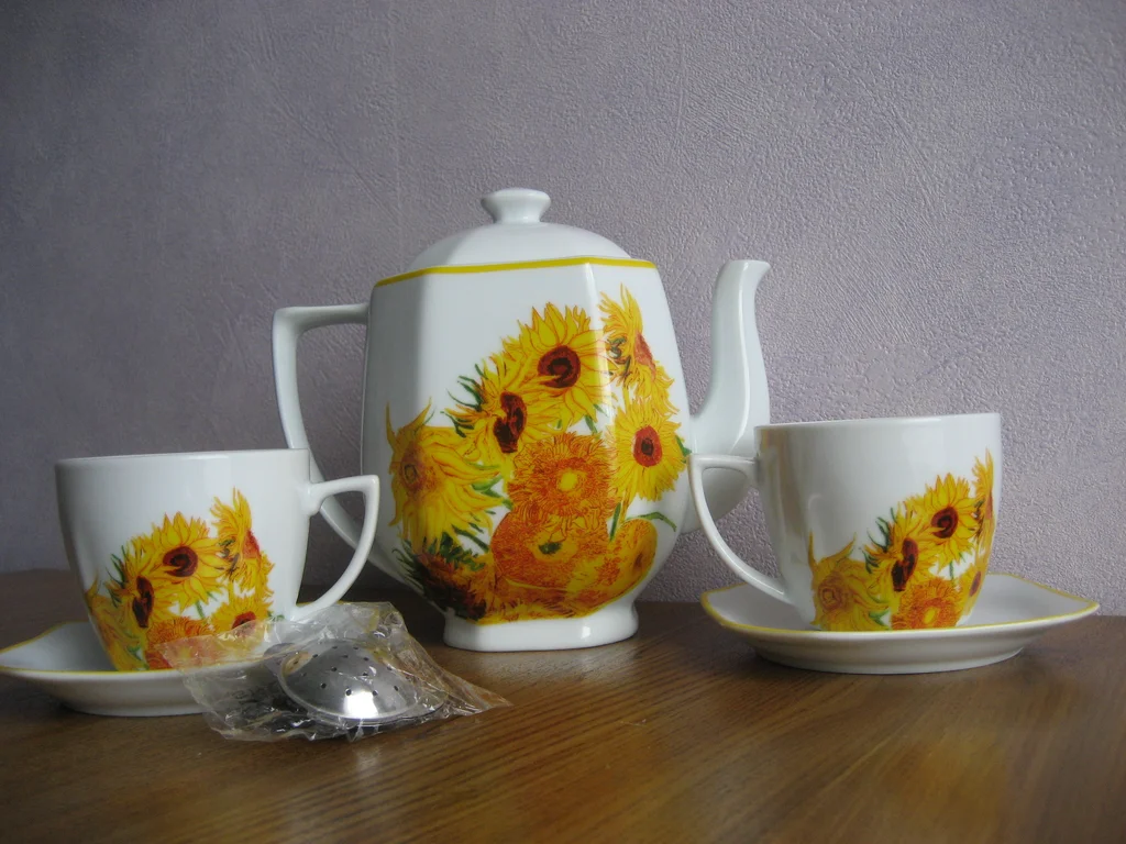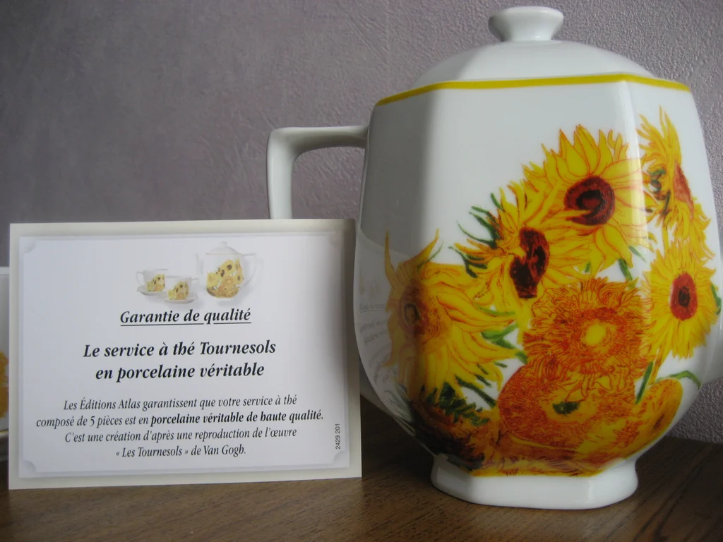 Service à thé " Tournesols " comprenant : - 1 théière : hauteur 16 cm, longueur 18 cm, largeur 10 cm - 2 tasses : diamètre 7,4 cm, hauteur 6,9 cm, longueur 9,7 cm - 2 sous-tasses : 11 cm x 11 cm - 1 infuseur à thé en porcelaine véritable de haute qualité. Création d'après une reproduction de l'oeuvre " Les Tournesols " de Van Gogh. Editions Atlas -( avec inscription au dos de chaque pièce ). *** Article NEUF, jamais servi , mais je n'ai plus l'emballage d'origine. Pour compenser ce petit manque, je vous envoie un tote-bag collector " 50 ans Harrys " . Possibilité d'envoi.