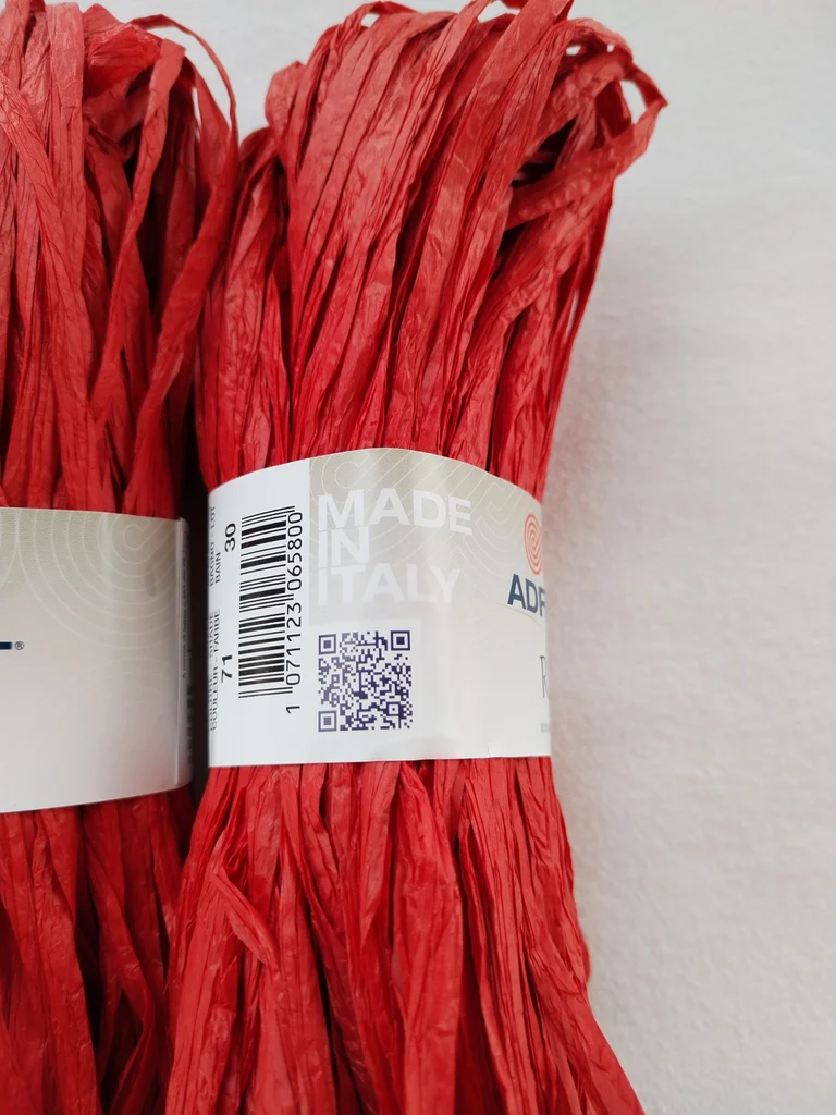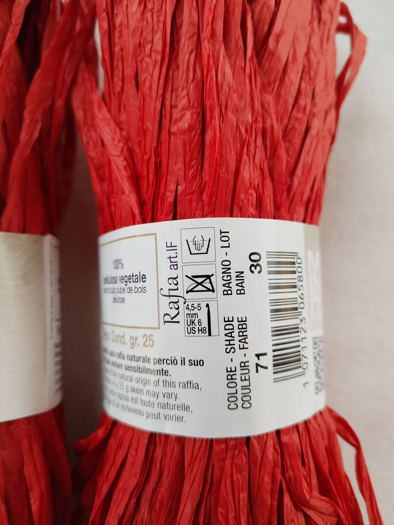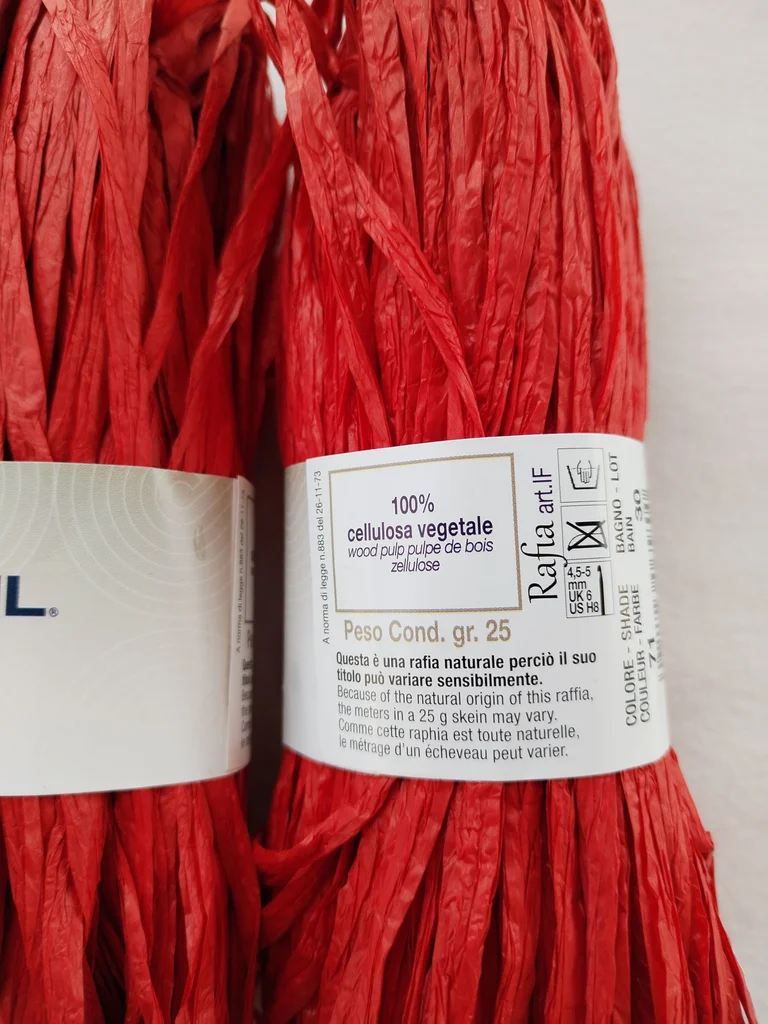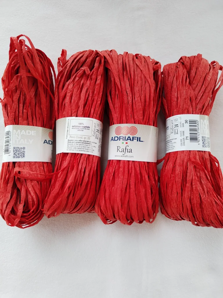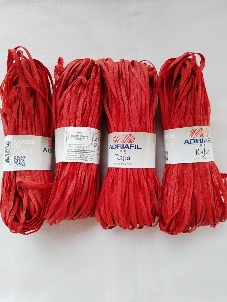Lot de 4 écheveaux de 25g de la marque italienne Adriafil, référence "Rafia". Idéal pour vos créations estivales ! Ce n'est pas du plastique, mais du vrai raphia naturel (100% cellulose végétale / pulpe de bois), très souple et agréable à crocheter. 📝 Détails du produit : Couleur : Rouge (Shade 71) – un rouge vibrant et élégant. Bain (Lot) : 30 (tous identiques pour un rendu uniforme). Poids total : 100g (4 x 25g). Composition : 100% cellulose végétale. Entretien : Lavable à la main. Fabrication : Made in Italy 🇮🇹 💡 Conseils d'utilisation : Crochet recommandé : 5 mm. Idéal pour : Sacs de plage, chapeaux de soleil (type Fedora ou Capeline), pochettes, dessous de plat ou paniers décoratifs. Le petit plus : Contrairement au raphia de jardinage, celui-ci est conçu pour être doux au toucher et ne pas irriter les mains pendant le travail. État : comme Neuf, jamais utilisé avec bagues d'origine. Envoi rapide et soigné. N'hésitez pas si vous avez des questions !