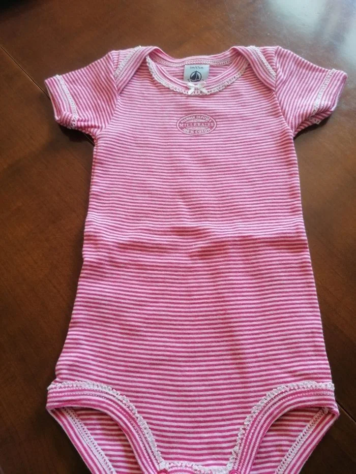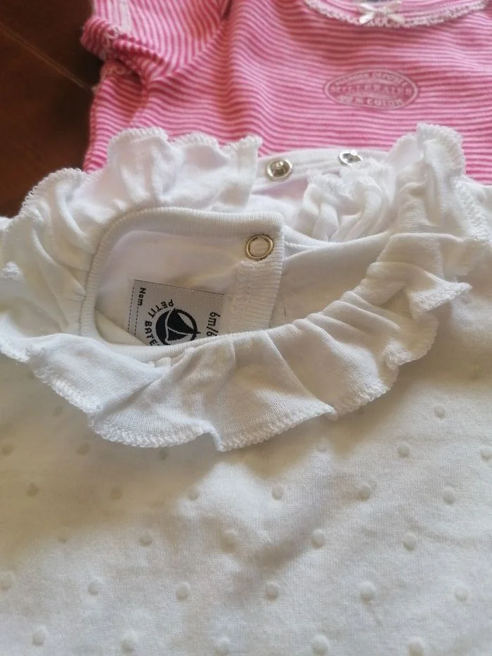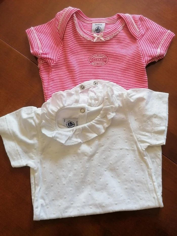 2 bodies fille 6mois Manche courte Coton Non taché, ni décoloré, ni déchiré, ni troué etc... Parfait état Petit bateau