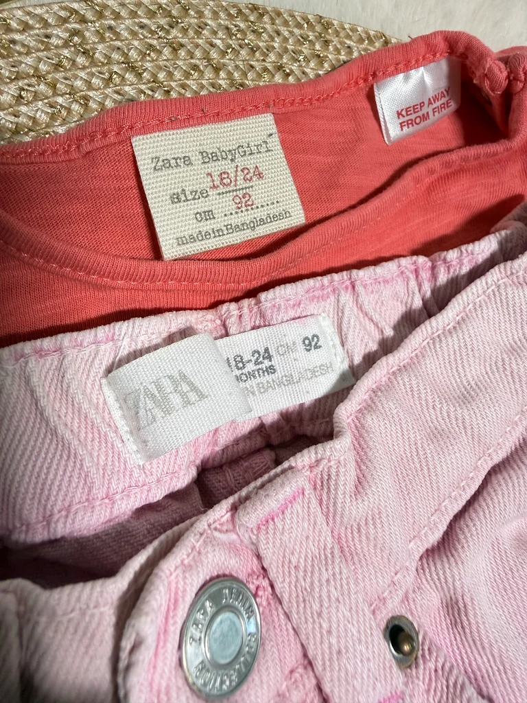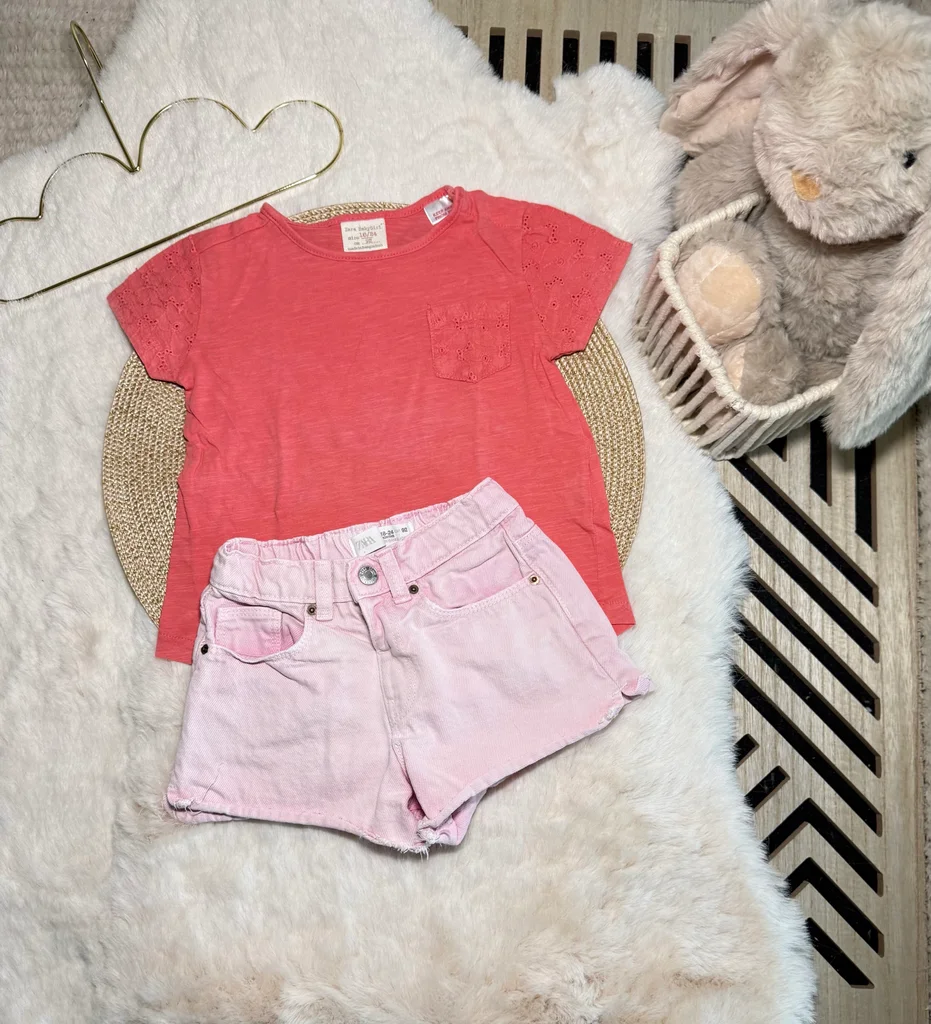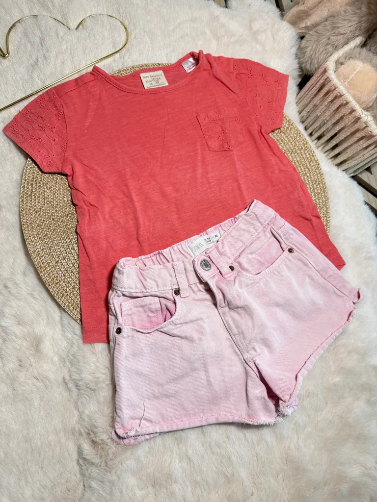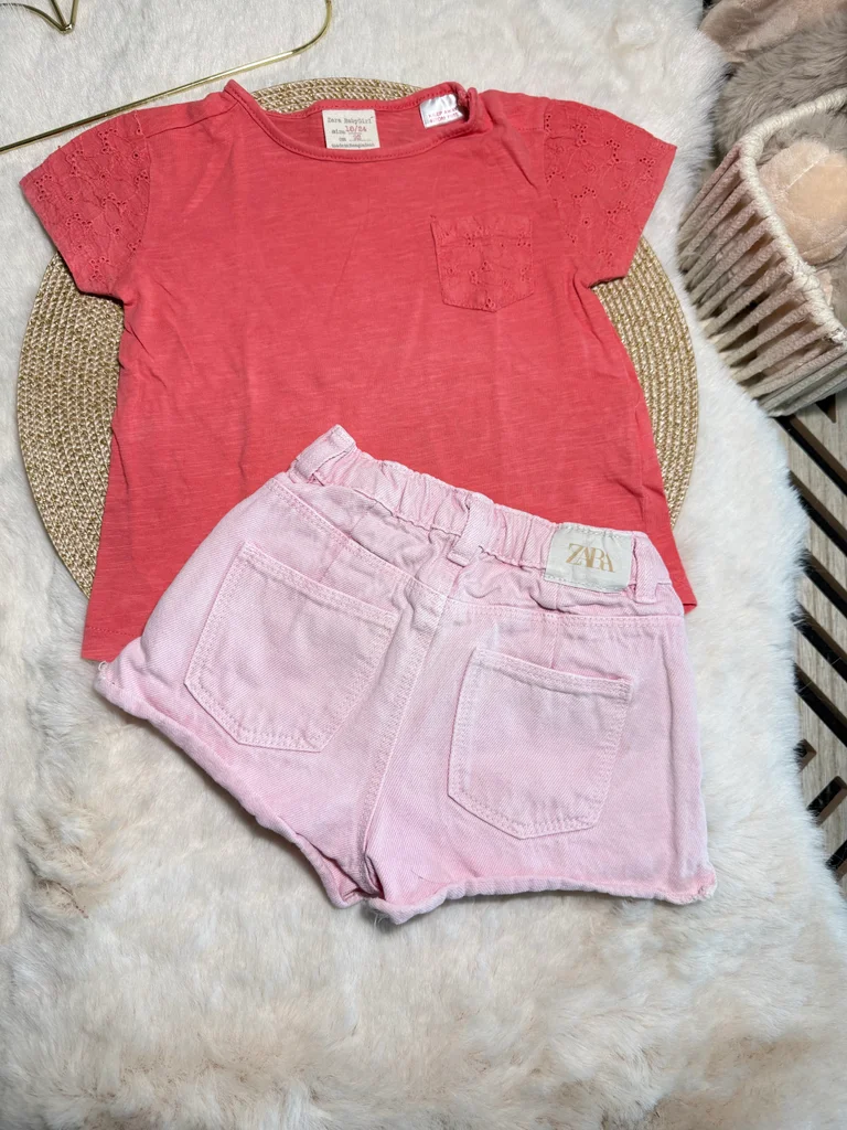 Ensemble été fille - Zara composé de 🌸 Short en jeans rose 🌸 T-shirt manches courtes fuschia 🧸 Taille 18/24 mois - 92cm 🧸 Très bon état