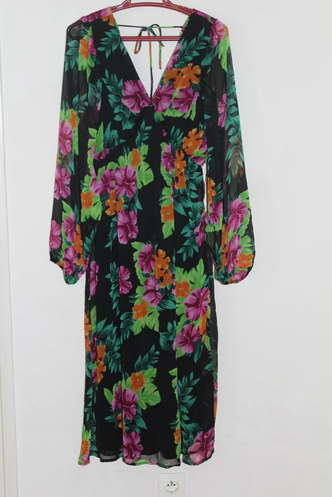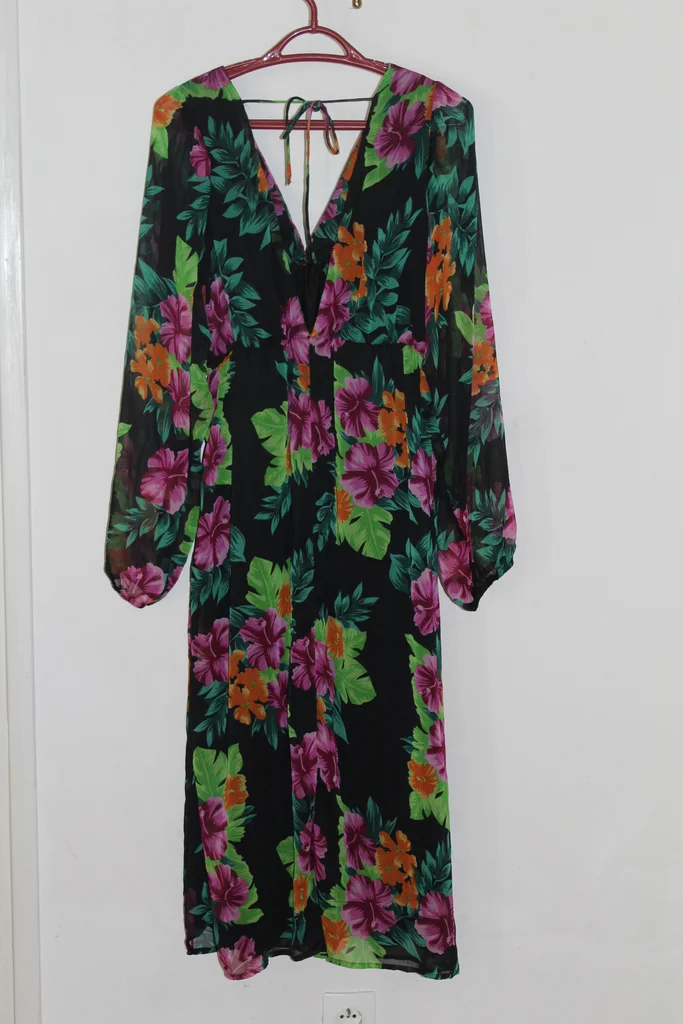 #mlaurie823vêtementsfemmetaille38 robe longue fond noir , grosses fleurs pas d'étiquette largeur épaules 35 cm longueur manches depuis épaule 70 cm largeur aisselle à aisselle 47 cm longueur manche depuis aisselle 52 cm largeur taille élastique 38 à 44 cm hauteur 128 cm