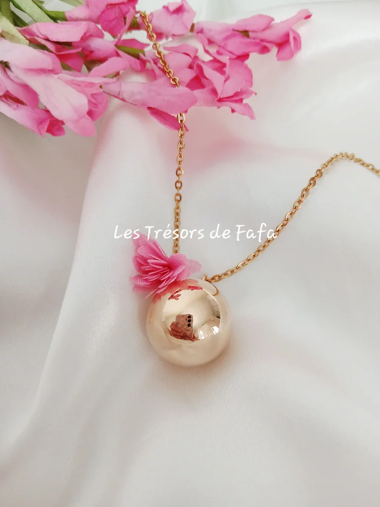 🤰 Bola de grossesse composé : - d'une chaîne en acier inoxydable doré d'une longueur d'environ 107 cm. - d'une boule sonore plaquée or de diamètre 20 mm. - d'un pendentif fleur rose.