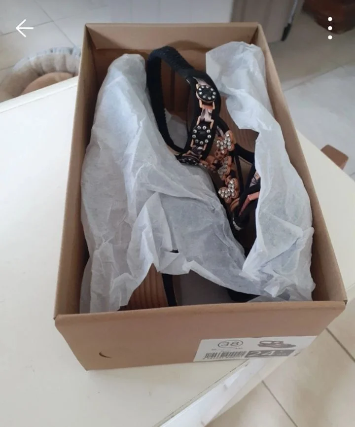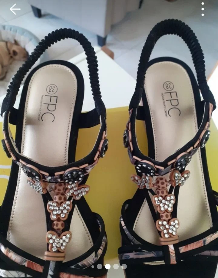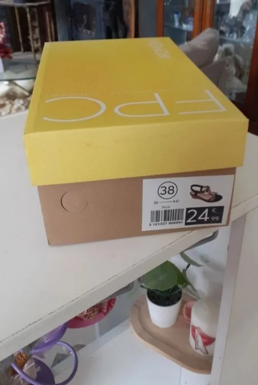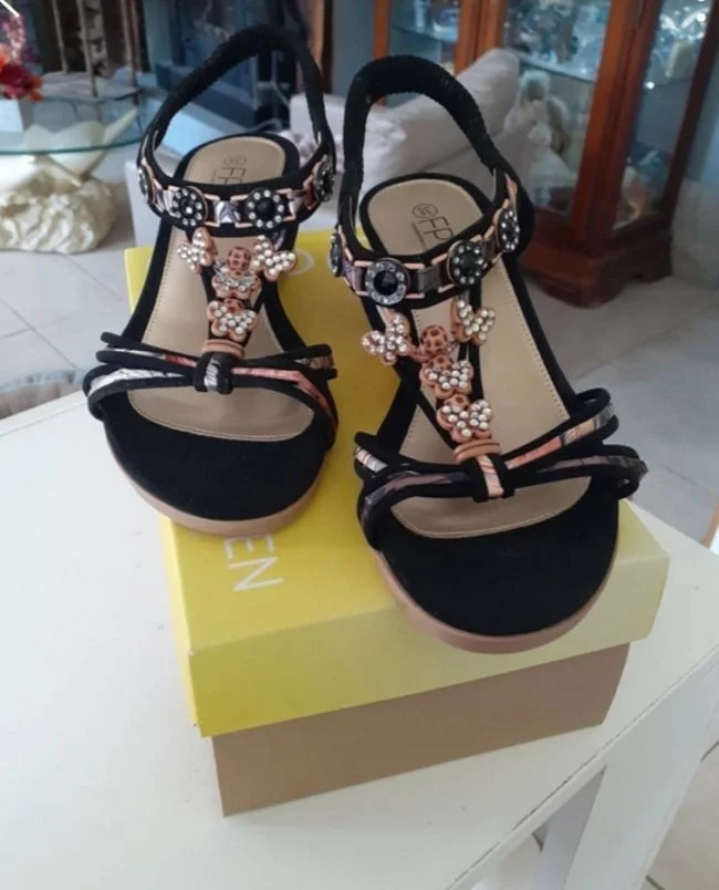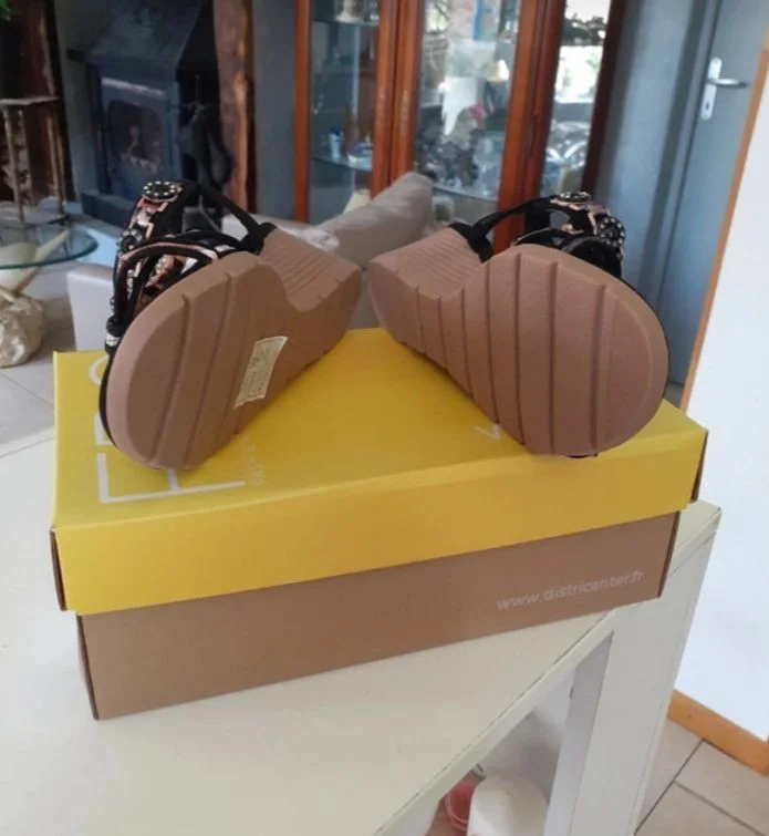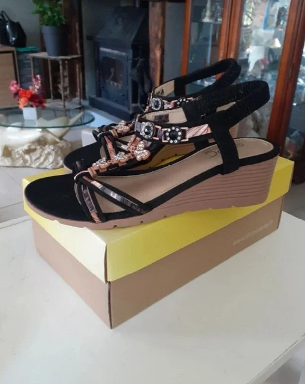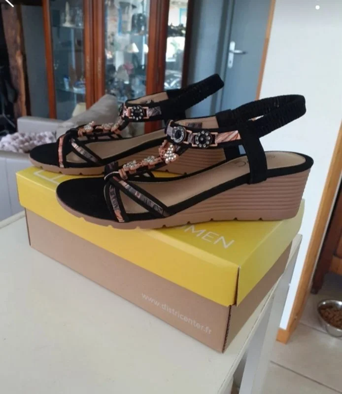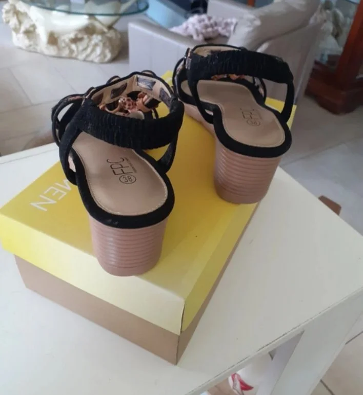 Sandales noires brillantes FPC Taille 38 Élastique derrière pour maintenir la cheville Talons compensés 5 cm Longueur 23 cm Jamais porté Neuves