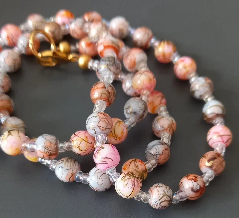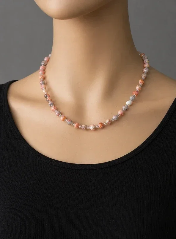 Collier en perles naturelles (agates roses) aux nuances rosées, beiges et légèrement marbrées, monté sur fil avec fermoir doré. Longueur 48 cm, il arrive juste en haut de la poitrine, parfait pour un rendu délicat et élégant. Très facile à porter au quotidien comme avec une tenue plus habillée, il ressort particulièrement bien sur un haut noir. Pièce unique, style doux et intemporel. État neuf Fermoir mousqueton Beaucoup plus beau en réel