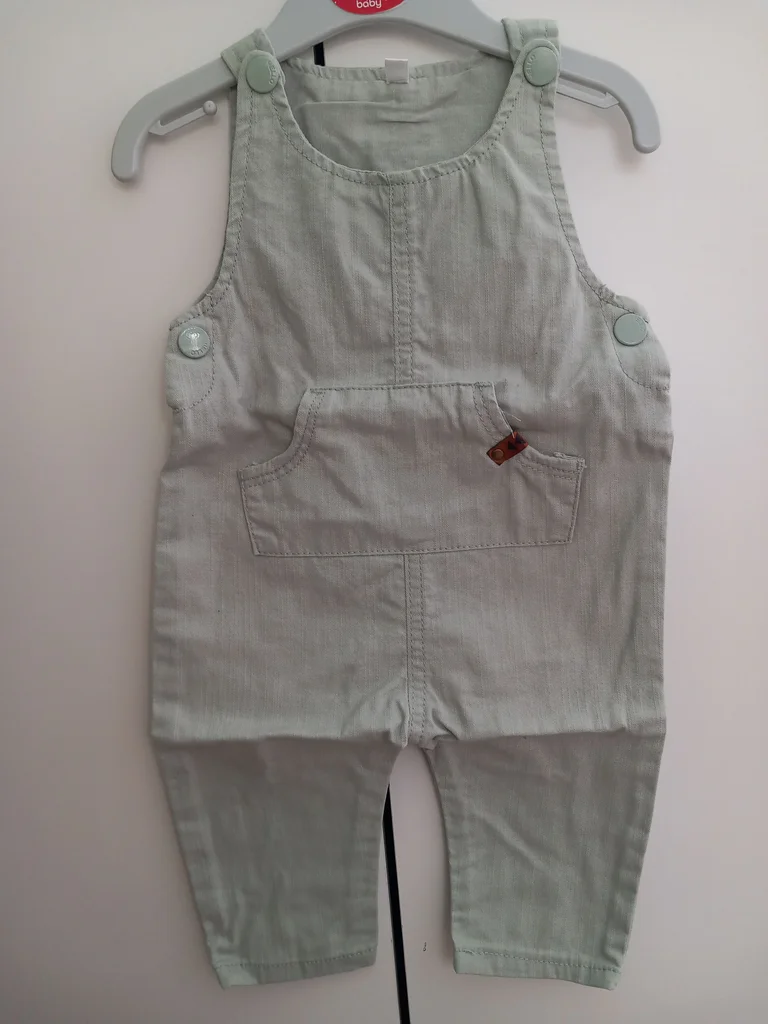 Description : Vends salopette pour bébé de la marque Zeeman. Taille : 56 cm Couleur : Vert d'eau / Vert amande (coloris doux et mixte). Matière : 100% coton, tissu léger et confortable. Détails : * Bretelles boutonnées sur le devant. Boutons de pression sur les côtés pour un habillage facile. Jolie poche kangourou centrale avec petit détail imitation cuir sur le côté. État : Très bon état, comme neuve. Maison saine (non-fumeur)
