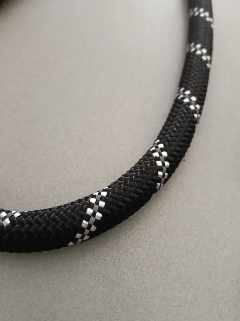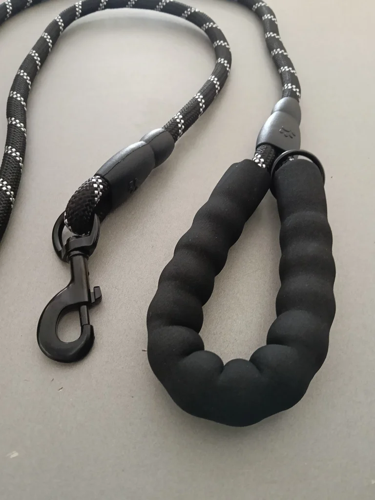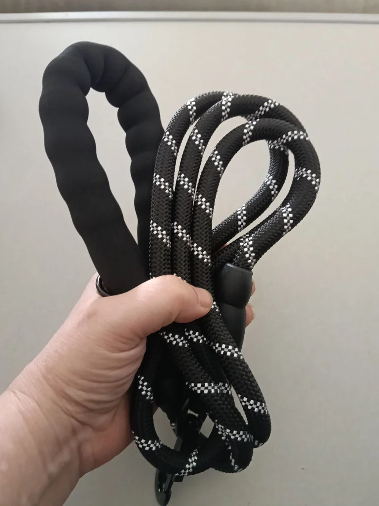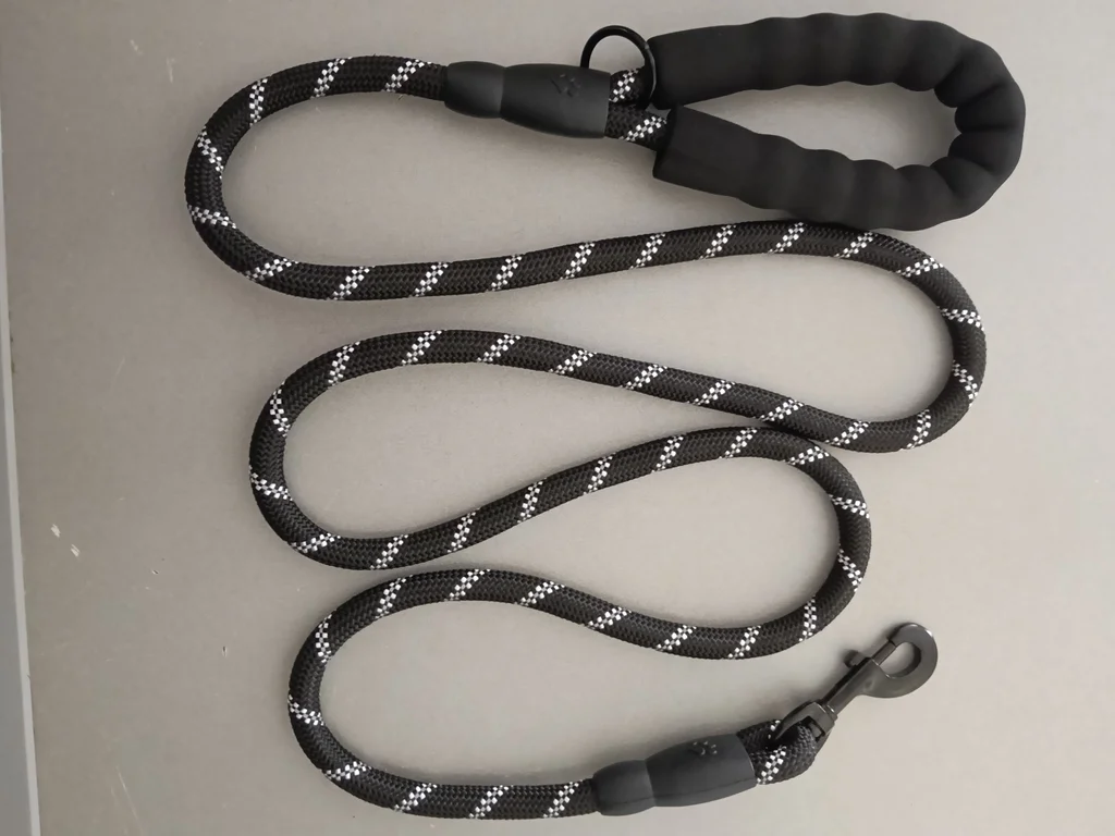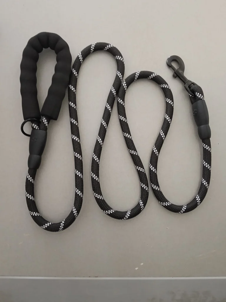 Laisse pour chien en corde résistante, coloris noir avec bandes réfléchissantes pour plus de visibilité. ✔ Poignée rembourrée très confortable ✔ Mousqueton solide et pratique ✔ Matière robuste et durable ✔ Idéale pour promenades quotidiennes ✔ Convient aux petits, moyens et grands chiens État : Neuf