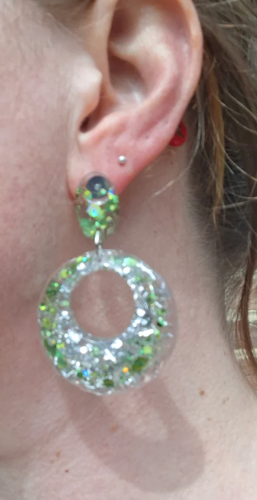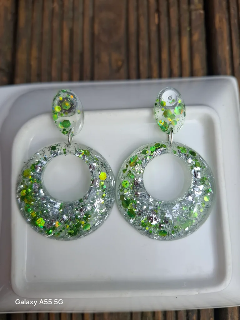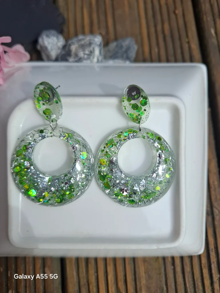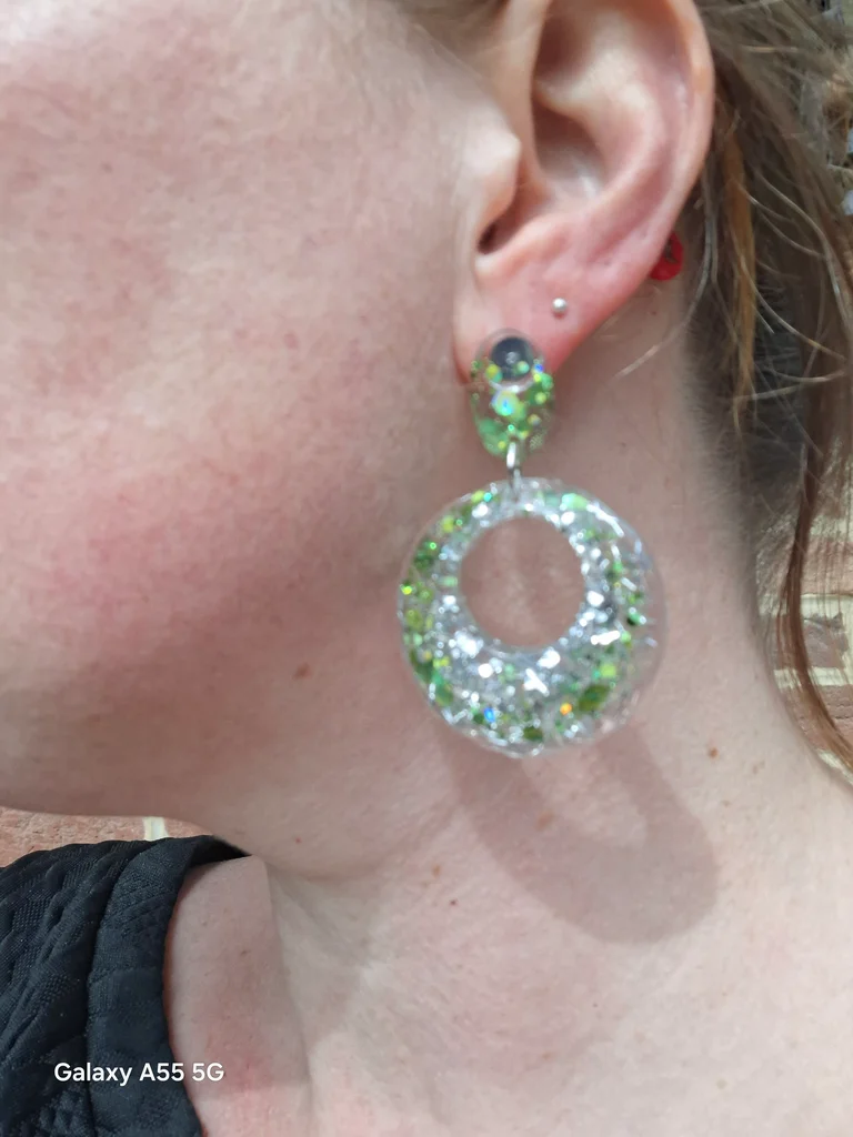 Plonge dans un univers végétal avec ces boucles d’oreilles aux nuances de vert éclatant 🌿✨ Elles évoquent la fraîcheur d’une forêt au petit matin, lorsque la lumière danse sur les feuilles encore couvertes de rosée. Les éclats verts et argentés rappellent la nature vivante : l’herbe, les feuillages, la lumière qui traverse les arbres… Chaque reflet capte l’énergie du vivant et apporte une touche de fraîcheur à ton style. Leur forme circulaire moderne et leur transparence subtile donnent une sensation de légèreté, comme une bulle d’air pur au creux de tes oreilles 💫 Chaque paire est unique, réalisée à la main avec soin.