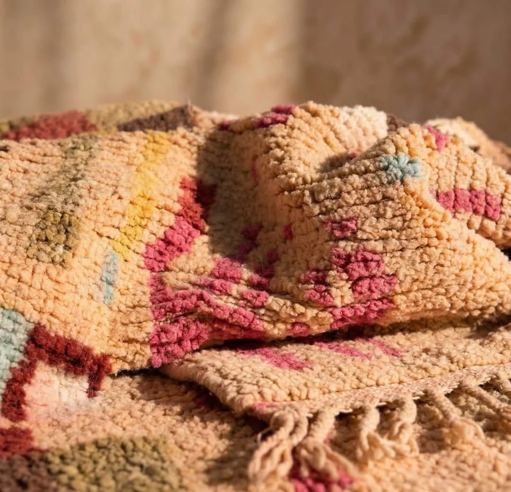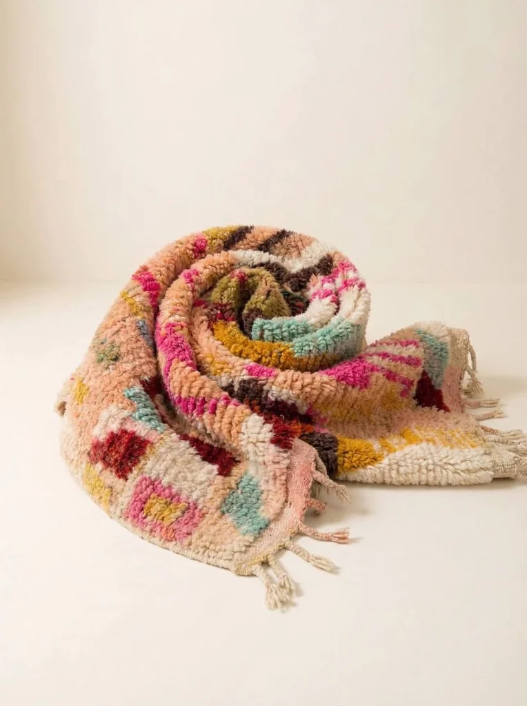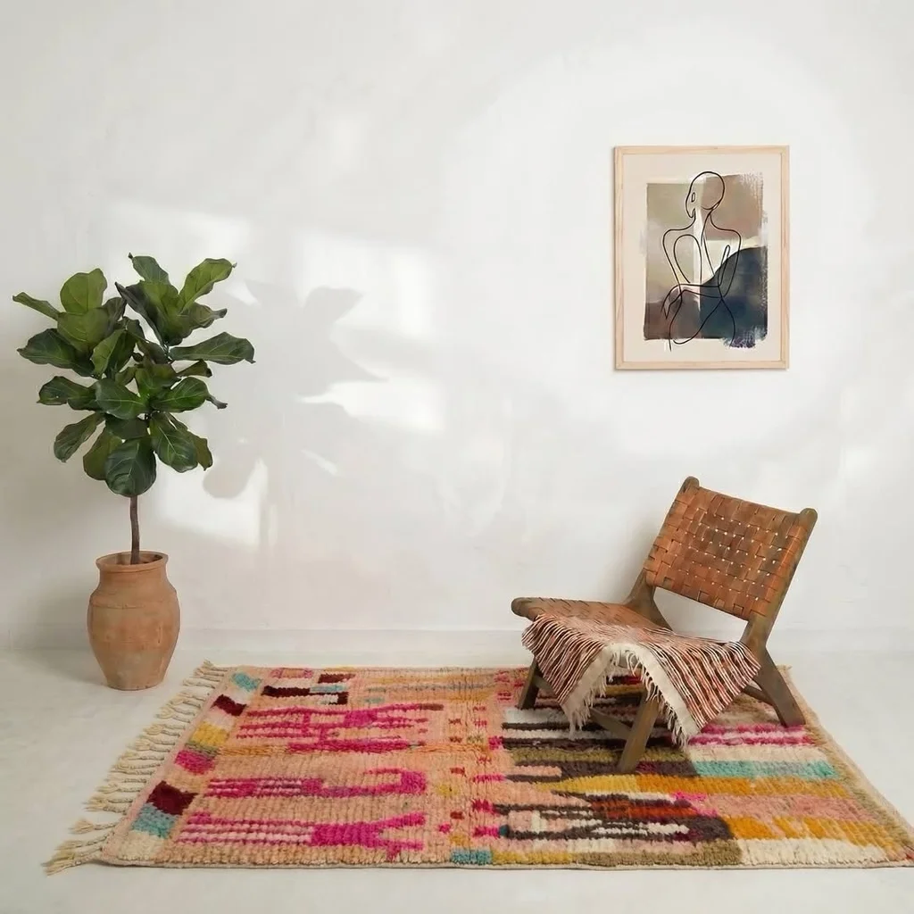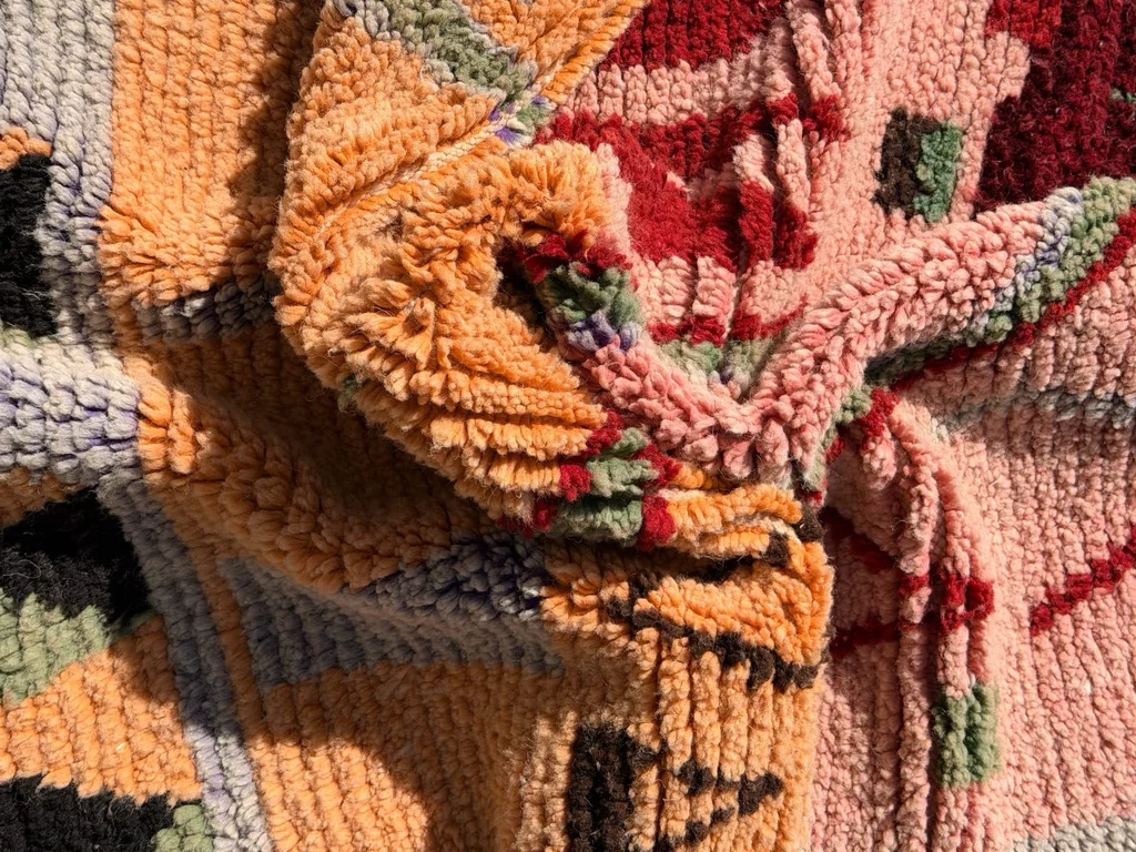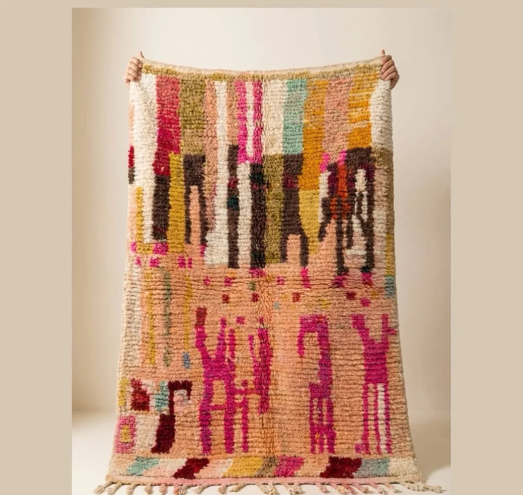 Sublime tapis berbère de la tribu Azilal au Maroc. Ce tapis a été tissé à la main sur un métier à tisser traditionnel en bois. Les tisseuses expriment leurs humeurs au travers de dessins abstraits et de symboles berbères aux couleurs punchy. tapis neuf Dimensions: 150X100cm