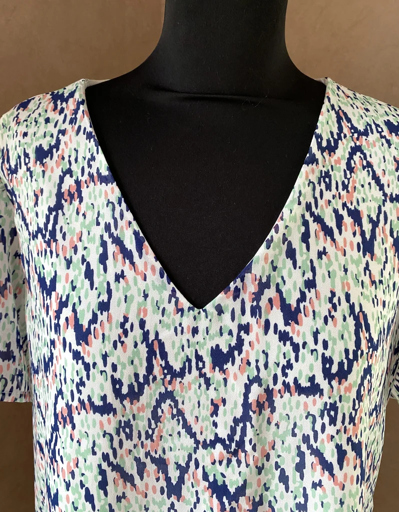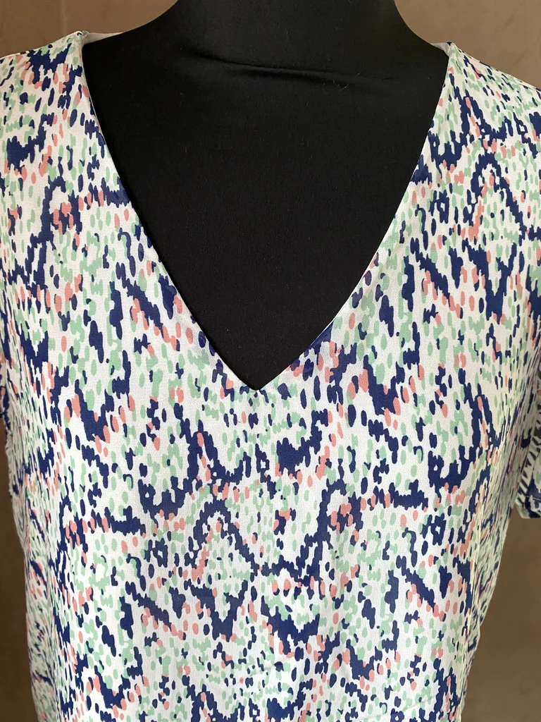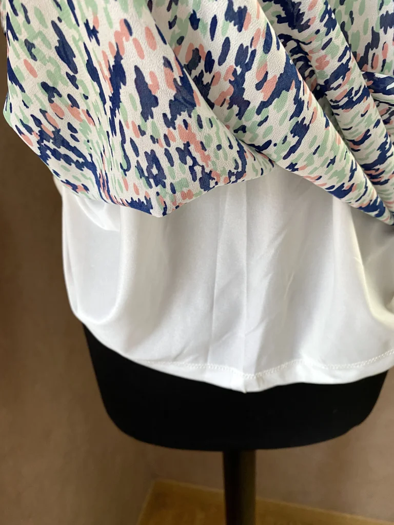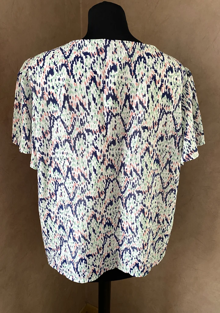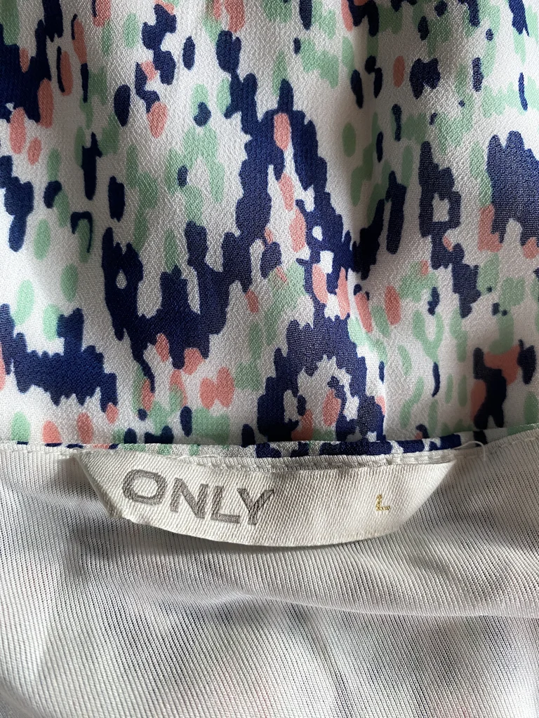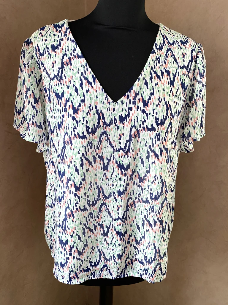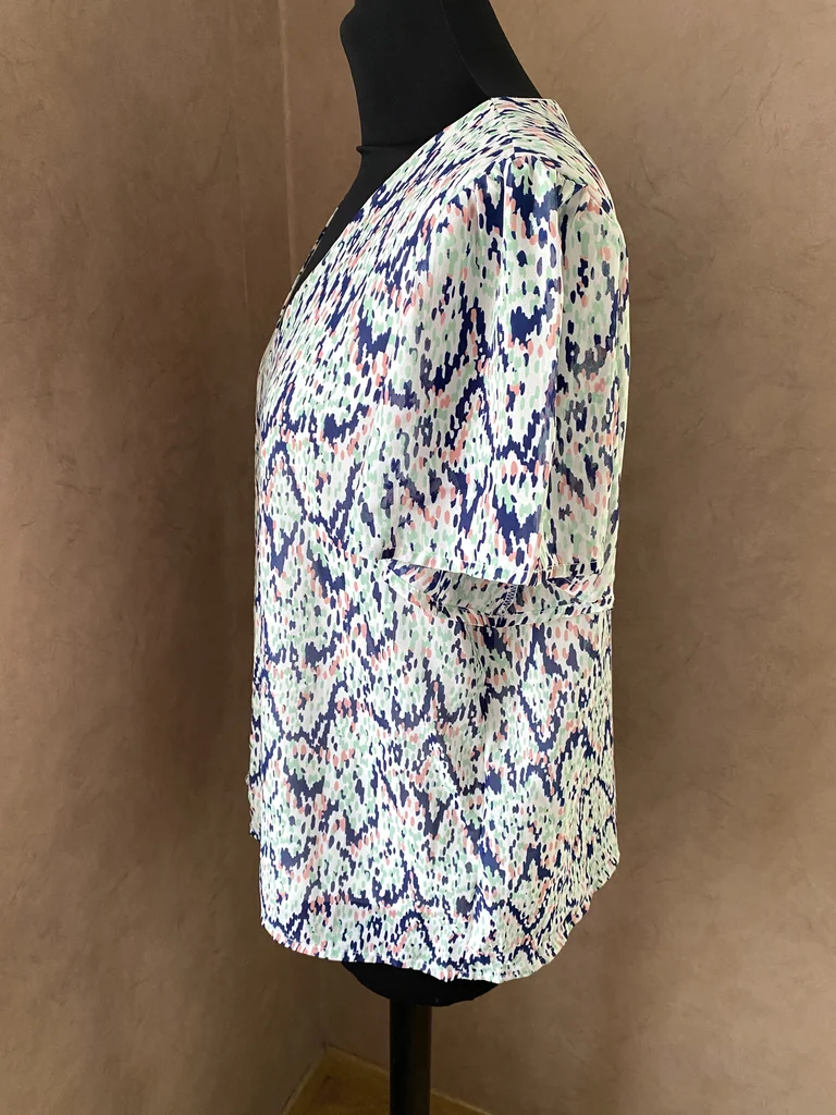 Jolie blouse ONLY au style moderne et facile à porter, idéale pour un look frais et tendance 🌸 ✨ Description : Blouse à fond blanc avec un imprimé abstrait graphique mêlant des touches de bleu marine, vert menthe et rose poudré 🎨 Taille : 40 En excellent état, jamais portée Matière : 100% polyester = facile d’entretien léger, fluide et agréable Fine doublure unie sur le corps (non doublée sur les manches pour plus de légèreté) 👚 Détails : Encolure en V féminine Manches courtes légèrement fluides Coupe droite et confortable 📏 Dimensions : Longueur : 58 cm Épaules : 39 cm Aisselle à aisselle : 54 cm Parfaite pour la mi-saison ou l’été 💥envoi rapide du colis 💥
