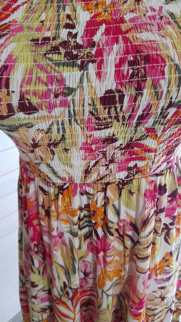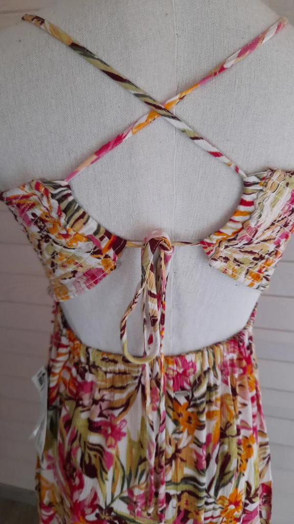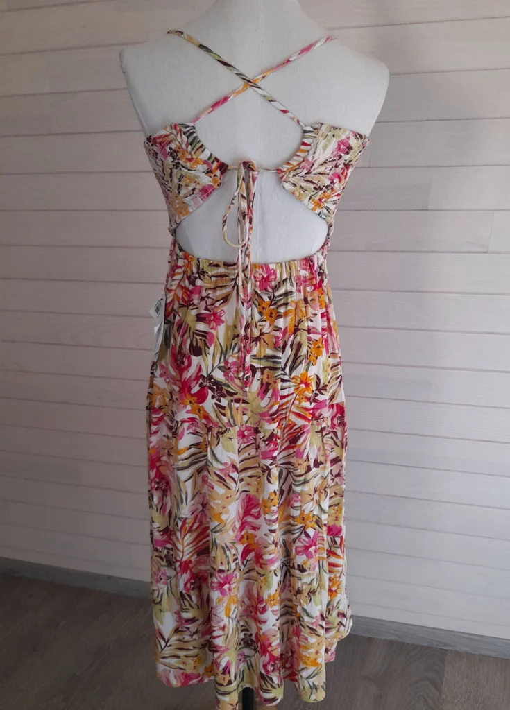 Robe midi à fleurs avec partie smock élastique sur le haut de la robe.Dos nu avec plastron à nouer. Non doublée. Neuve.