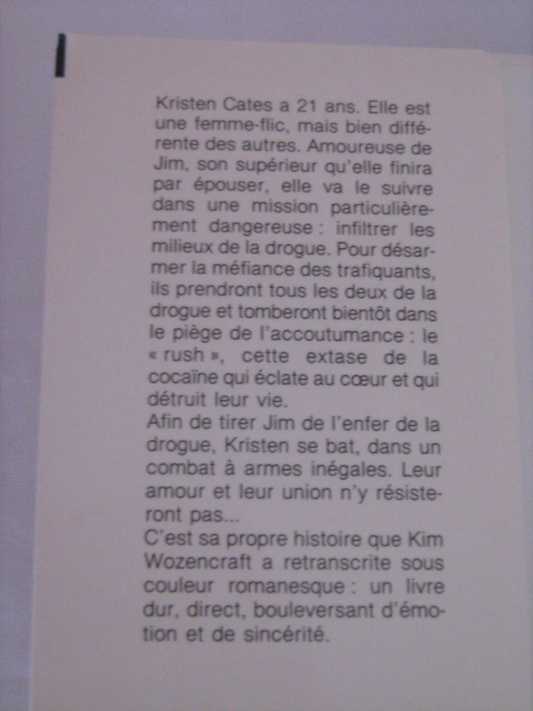 Vends livre Rush de Kim Wozencraft . Très bon état. "Kristen Cates a 21 ans. Elle est une femme-flic, mais bien différente des autres. Amoureuse de Jim, son supérieur qu'elle finira par épouser, elle va le suivre dans une mission particulièrement dangereuse : infiltrer les milieux de la drogue. Pour désarmer la méfiance des trafiquants, ils prendront tous les deux de la drogue et tomberont bientôt dans le pièce de l'accoutumance : le "rush", cette extase de la cocaïne qui éclate au cœur et qui détruit leur vie. Afin de tirer Jim de l'enfer de la drogue, Kristen se bat, dans un combat à armes inégales. Leur amour et leur union n'y résisteront pas..." C'est sa propre histoire que Kim Wozencraft a retranscrite sous couleur romanesque : un livre dur, direct, bouleversant d'émotion et de sincérité. N'hésitez pas à consulter mes autres annonces.