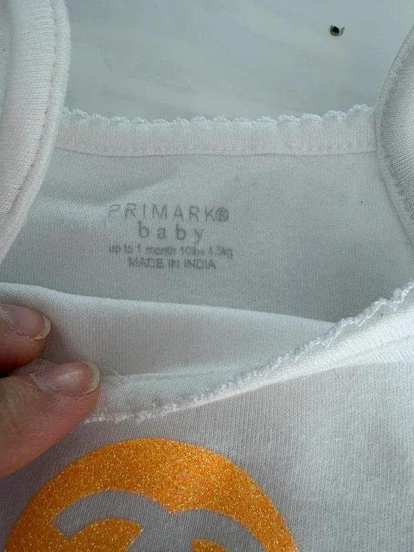 Body bébé Primark baby neuf, jamais porté ✨ • Taille : naissance / 1 mois (jusqu’à 4,5 kg) • Couleur : blanc avec motif orange fluo à paillettes ✨ • Bretelles fines, parfait pour l’été ☀️ • Fermeture à pressions à l’entrejambe • Matière : 100% coton, doux et agréable pour bébé Très joli avec son motif brillant qui donne un petit côté chic 💛 Idéal pour une tenue mignonne ou un cadeau de naissance. ⸻ 🔎 Mots-clés : body bébé, naissance, 1 mois, primark baby, body fille, bébé été, coton, blanc, doré pailleté, mignon, vêtement bébé, trousseau naissance, body bretelles, bébé fille