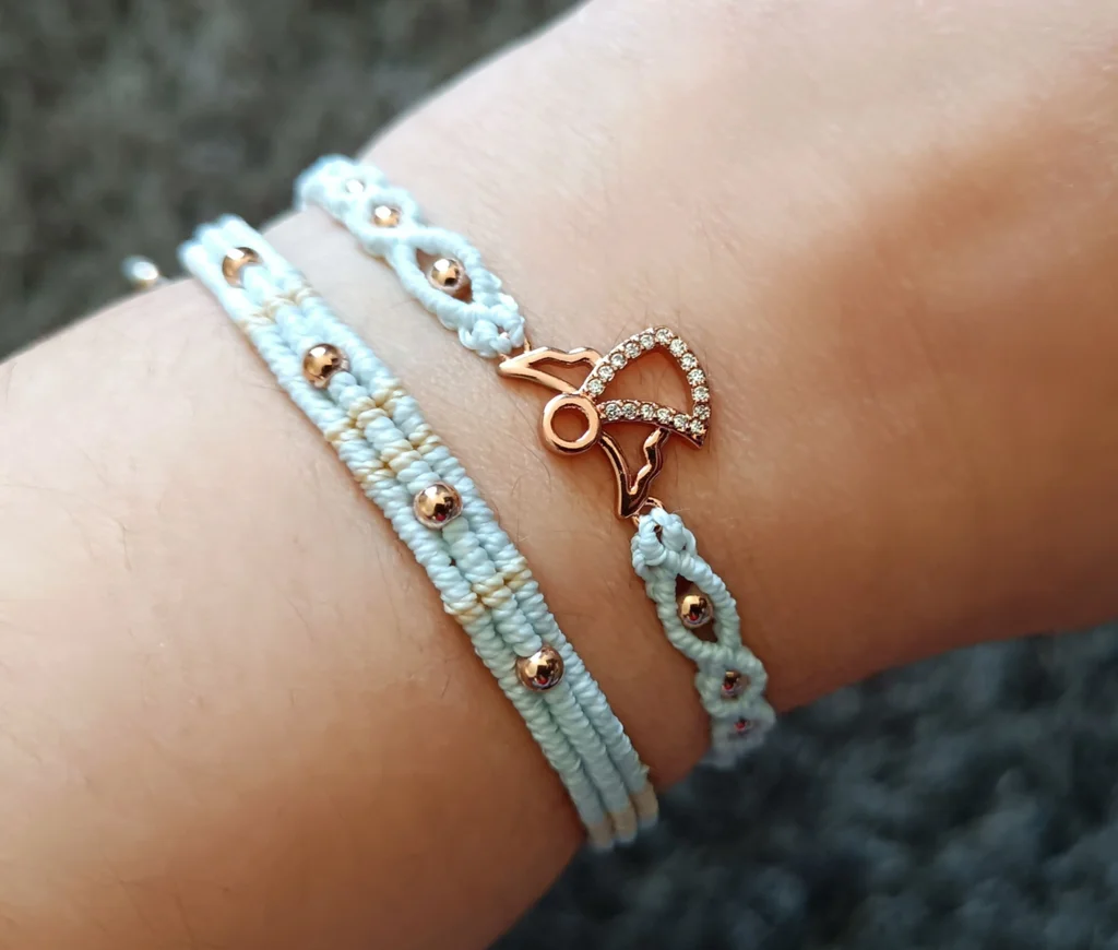 Set de bracelets fait main en macramé couleur bleu pâle et sable. Perles et charm ange or rose en acier inoxydable. Se règlent grâce aux nœuds coulissants.