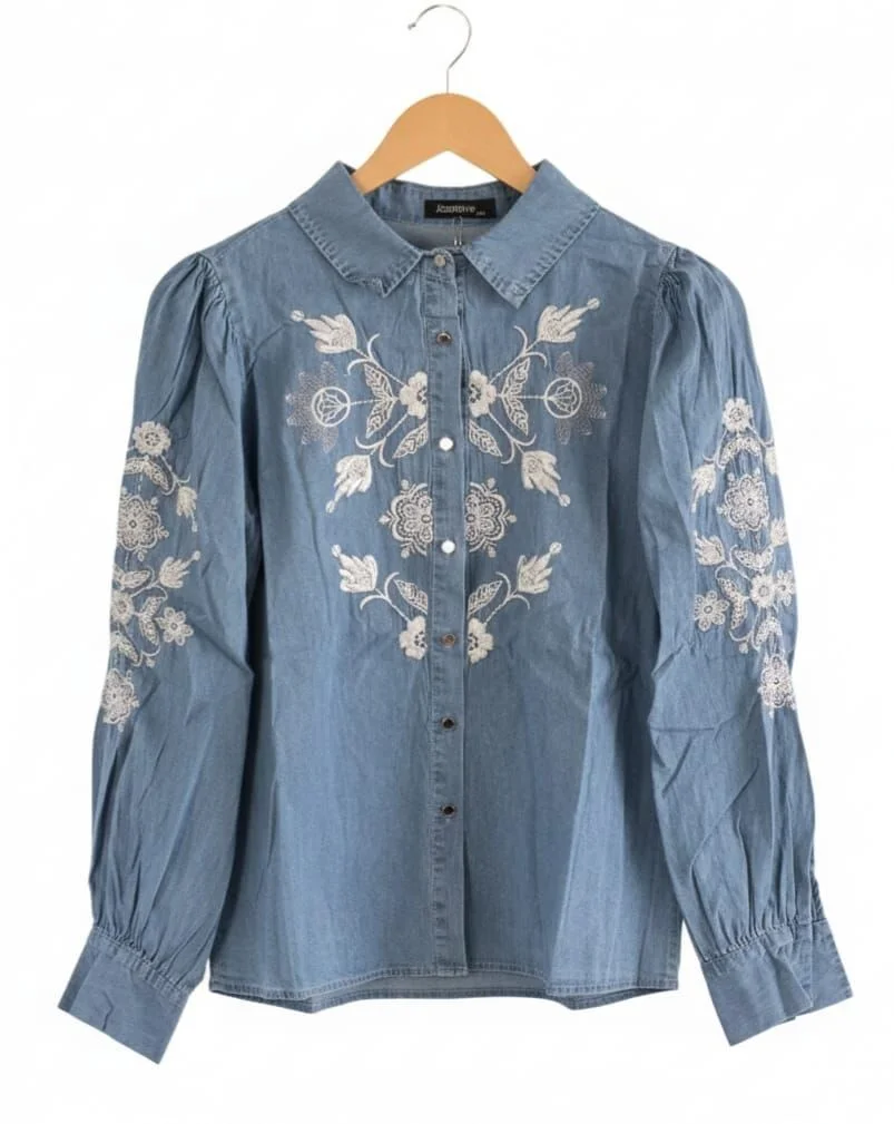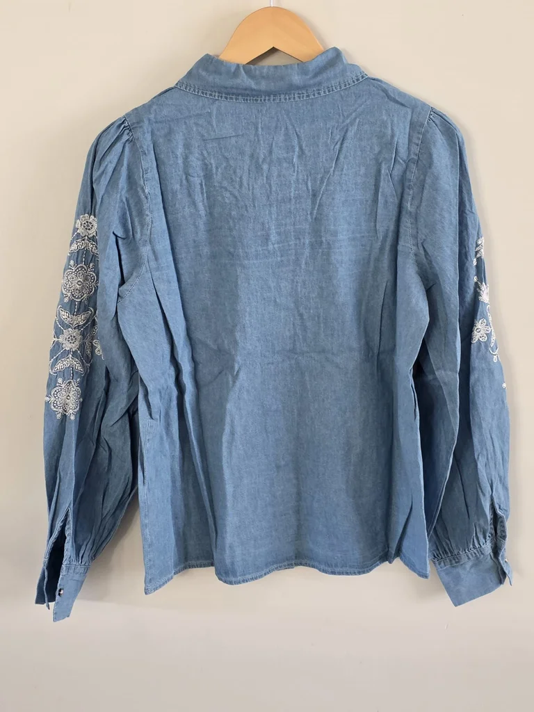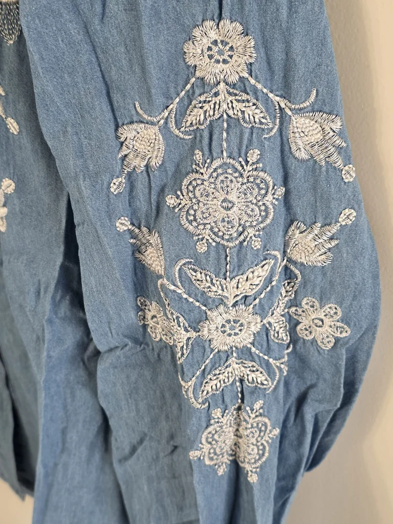 Ce qui fait son charme : Broderies délicates : Le buste et les manches sont sublimés par de magnifiques fleurs blanches brodées, apportant une élégance unique. Coupe "Puffy" : Un design vaporeux avec des épaules légèrement froncées pour une silhouette ultra romantique et tendance. Inspiration Vintage : Son denim clair et souple rend hommage au style authentique des années 70 et 90. Matière agréable : Conçue dans un mélange fluide (80% Coton / 20% Polyester) qui respire et ne se froisse quasiment pas. 📏 Dimensions & Mesures : Épaules : 40 cm Aisselle à aisselle : 50 cm Longueur totale : 60 cm Détails supplémentaires : Taille : M / 38 (indiquée S/M sur l'étiquette, convient parfaitement pour un 36 ou 38). État : Neuf avec étiquette. Marque : Jasmine. #fashion2026 #secondhand #ootd #trending #musthave #newwithtags #bohochic #bohemiastyle #coquettecore #cottagecore #softgirl #vintagevibes #seventiesstyle #ninetiesfashion #romantstyle #boholook #aesthetic #femininefashion