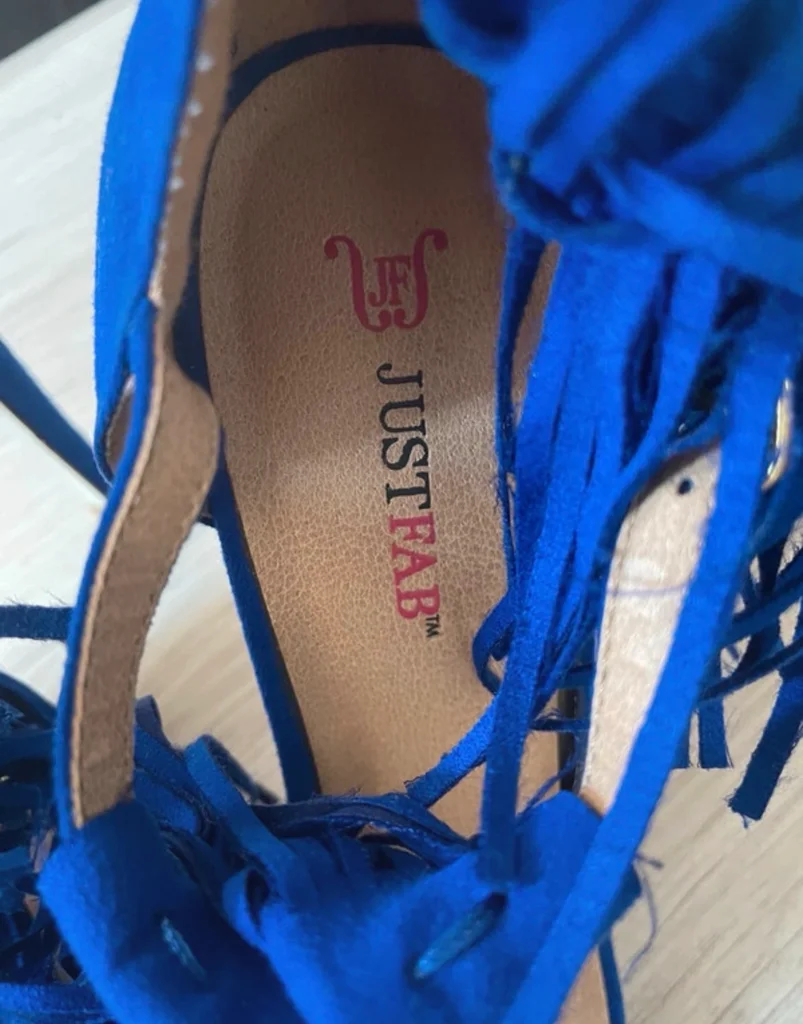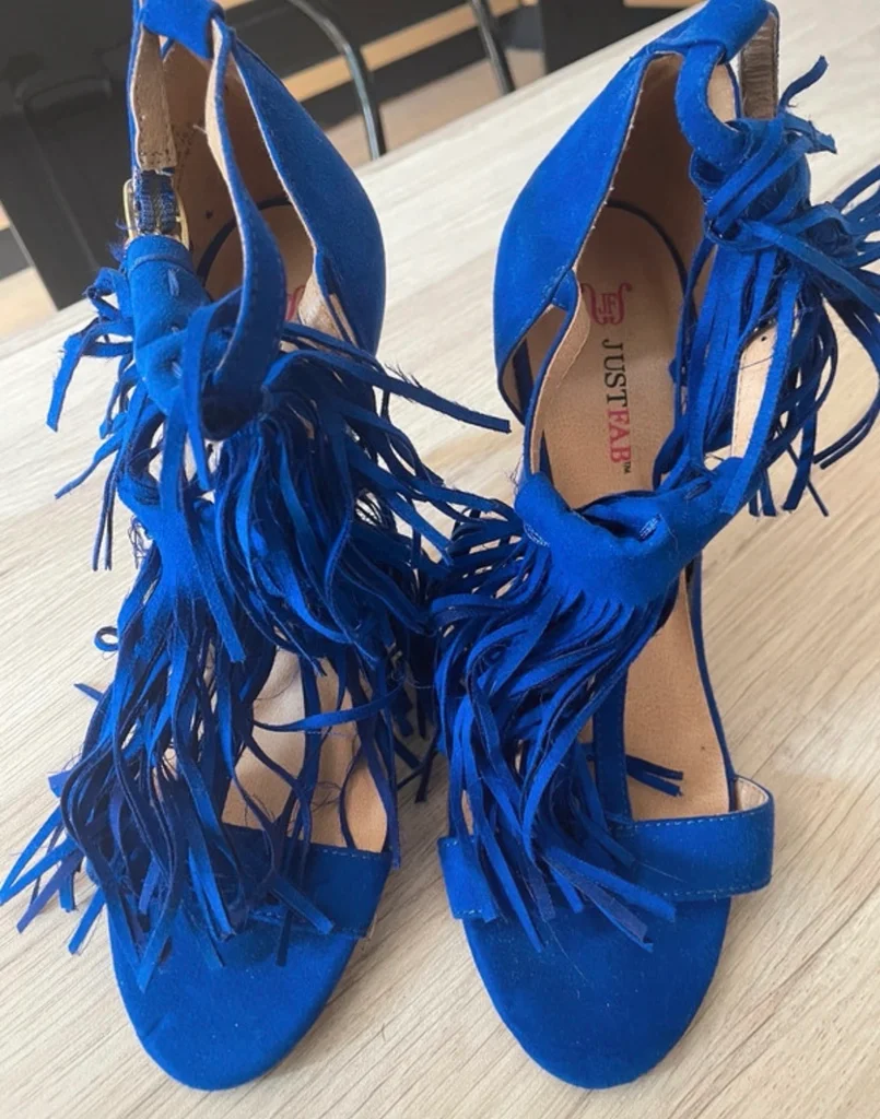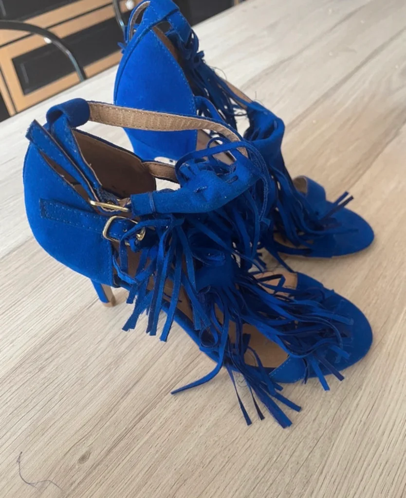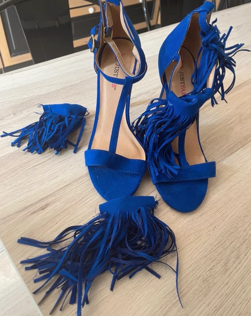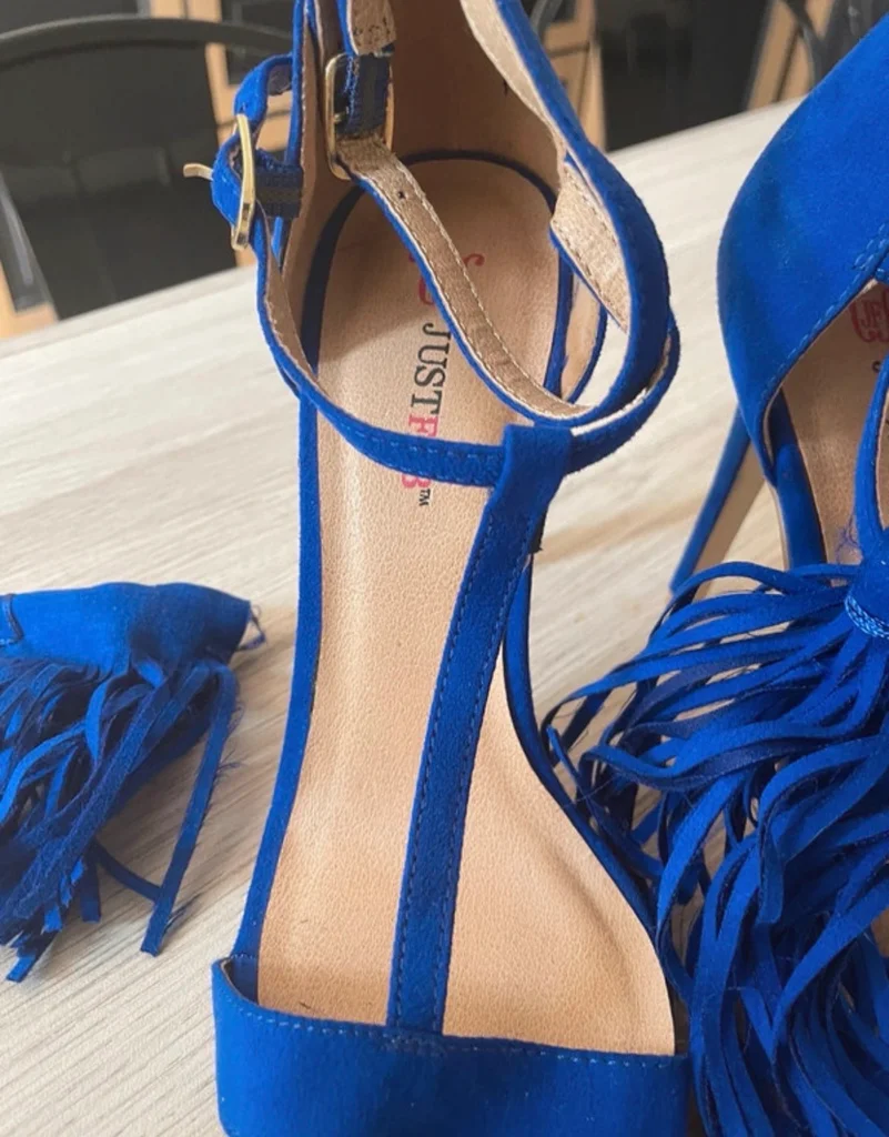 Je vends ces superbes escarpins bleu roi avec frange de la marque Justfab. Une paire originale et élégante, parfaite pour les soirées ou pour ajouter une touche bohème à votre tenue. - Type de produit : Escarpins - Univers : Femme - Marque : Justfab - Pointure : 36,5 - Couleur : Bleu roi - Détail : Franges amovibles Portée 1 fois