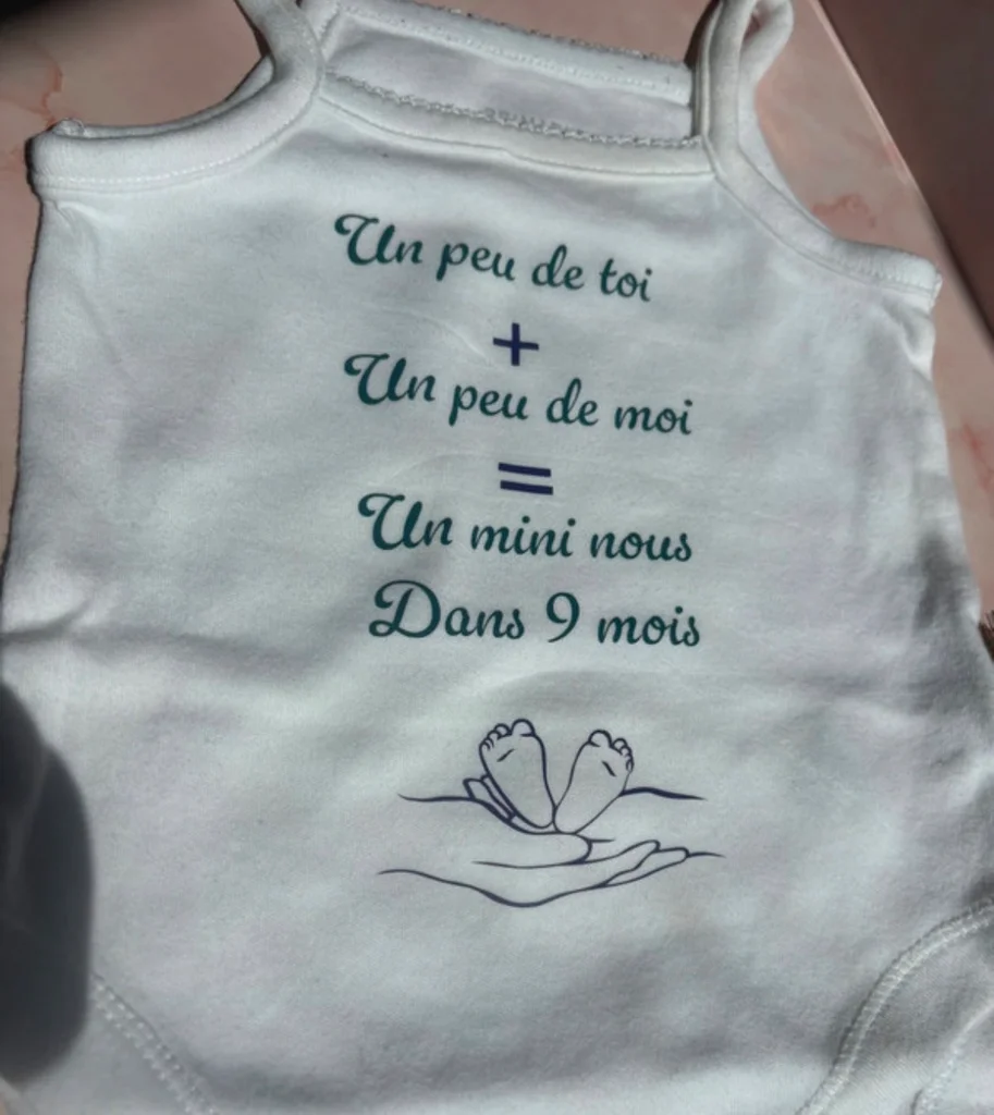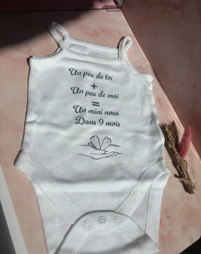 Body bébé blanc taille 0-3 mois avec joli message : “Un peu de toi + un peu de moi = un mini nous dans 9 mois” 🥰 écriture bleu canard et violet 💙💚💜 Parfait pour : ✨ annonce grossesse originale ✨ surprise futur papa / famille ✨ shooting grossesse ✨ cadeau naissance Body mixte, tout doux et confortable 👶 ✔️ Marque : Primark baby ✔️ Taille : 0-3 mois (62 cm) ✔️ Matière : 100% coton ✔️ Couleur : blanc ✔️ Fermeture pressions 📦 Envoi rapide et soigné #amandine181295bébé ⸻ Mots-clés : body bébé, 0-3 mois, naissance, annonce grossesse, mini nous, futur papa, futur maman, baby annonce, body message, coton, mixte, bébé mixte, cadeau grossesse, Primark baby