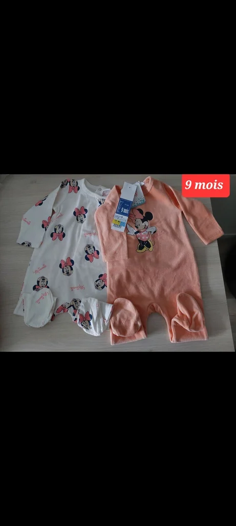 Vends Lot de grenouillères Minnie fille 9 mois Il y a une épaisse et une légère Elles sont en très bon état et elles ont été mises Il y a ni trous ni tâches Maison non fumeur Il y a le prix d'achat indiqué sur la photo