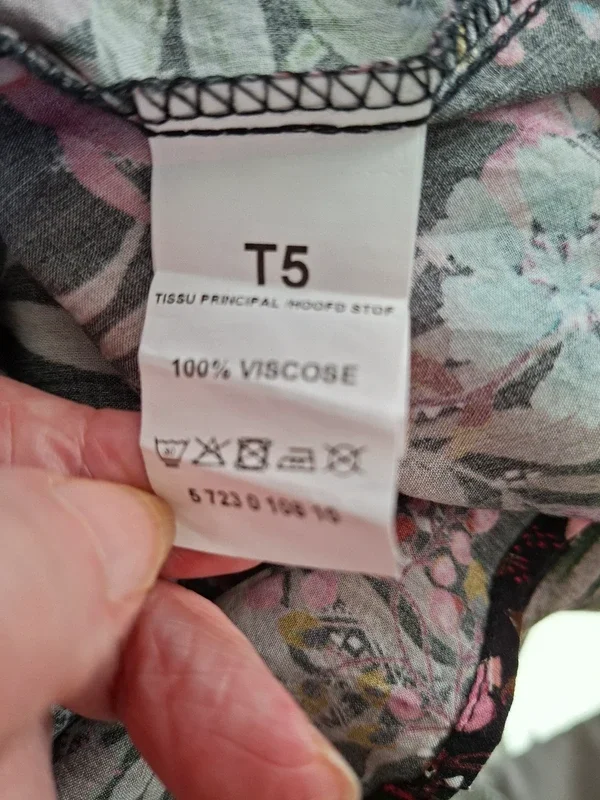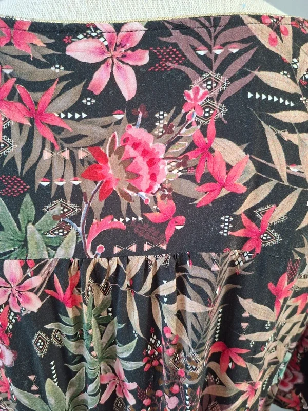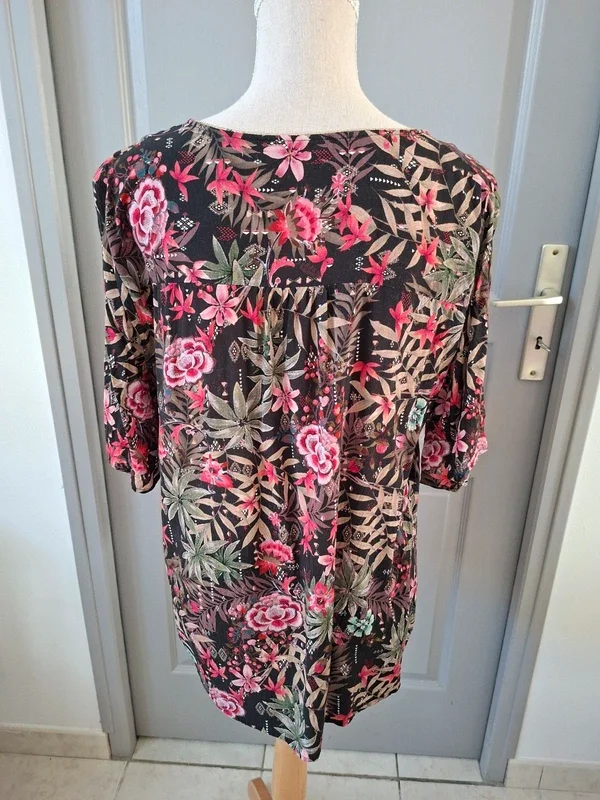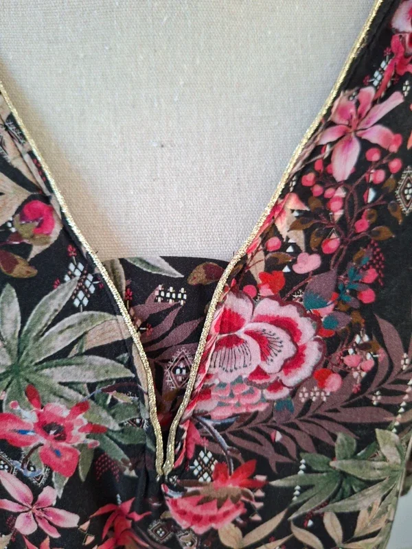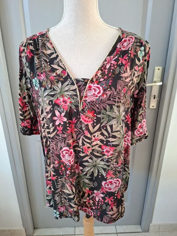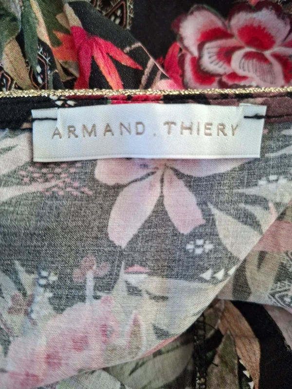 Armand thiery, haut imprimé, très bon état, peu porté Liseré doré autour de l encolure Dimension aisselles 58 cm T 5/44