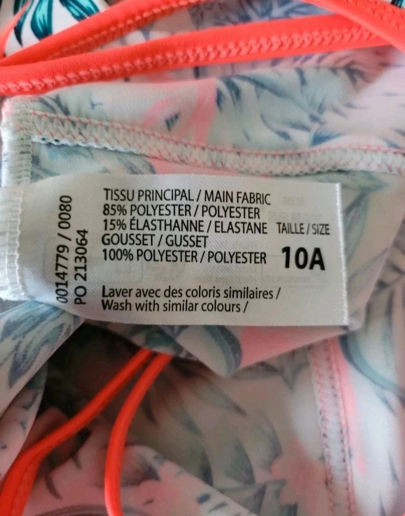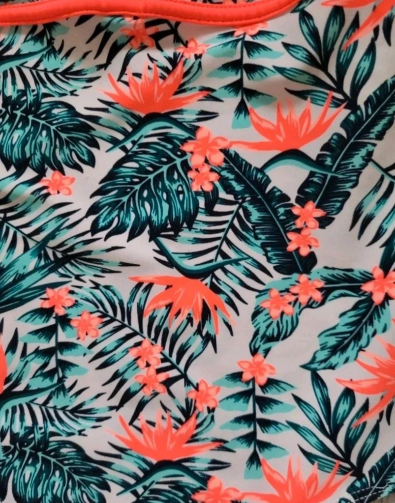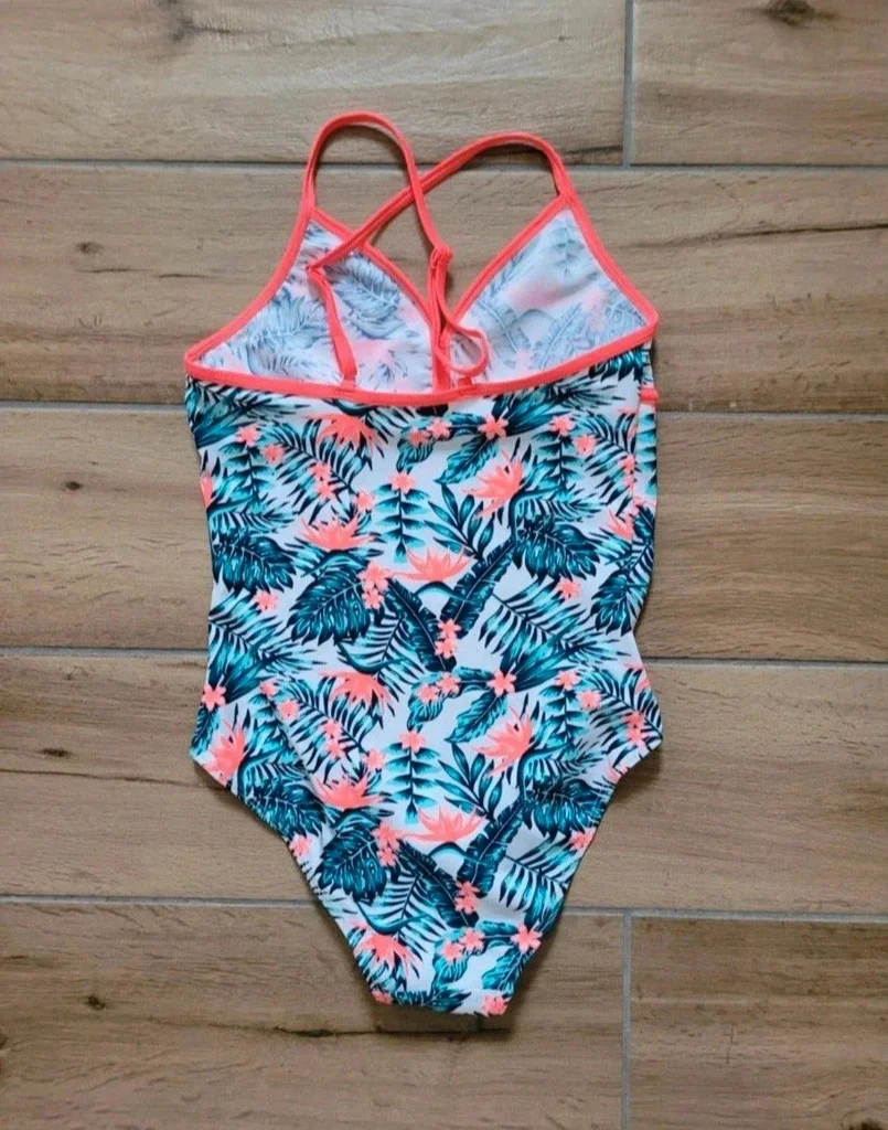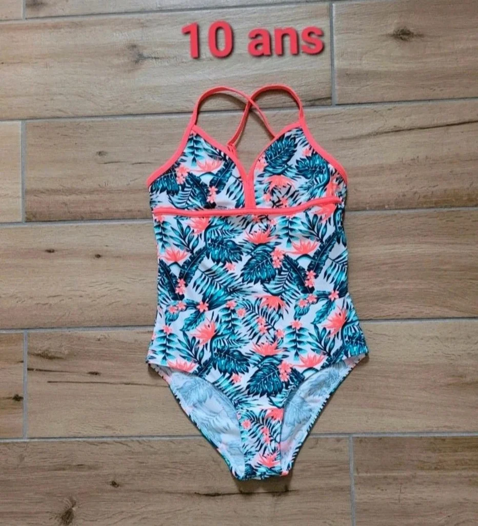 Vends magnifique maillot de bain une pièce pour fille, taille 10 ans. Il est décoré d'un superbe motif tropical composé de feuilles de palmier vert émeraude/bleu canard et de fleurs de tiaré corail/rose fluo sur fond blanc. Les bretelles sont corail fluo et se croisent élégamment dans le dos. Matière : 85% Polyester, 15% Élasthanne (doublure gousset 100% Polyester) État : Excellent état, comme neuf. Très peu porté. Ce maillot est parfait pour la plage ou la piscine cet été. Il est confortable, sèche rapidement et les couleurs sont éclatantes ! Livraison : Envoi rapide et soigné.