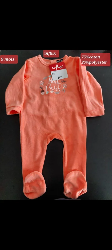 Vends Grenouillère fille 9 mois Elle est en très bon état et elle a été mise Il y a ni trous ni tâches Maison non fumeur Il y a le prix d'achat indiqué sur la photo