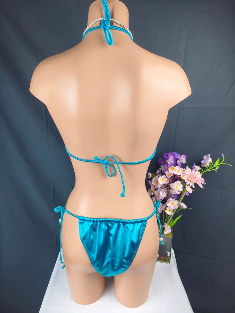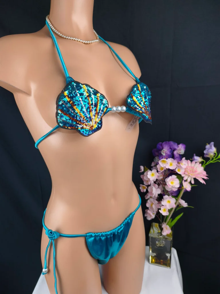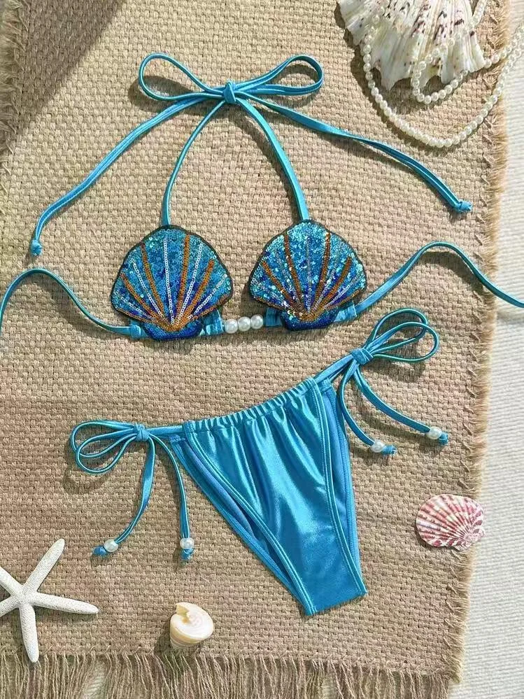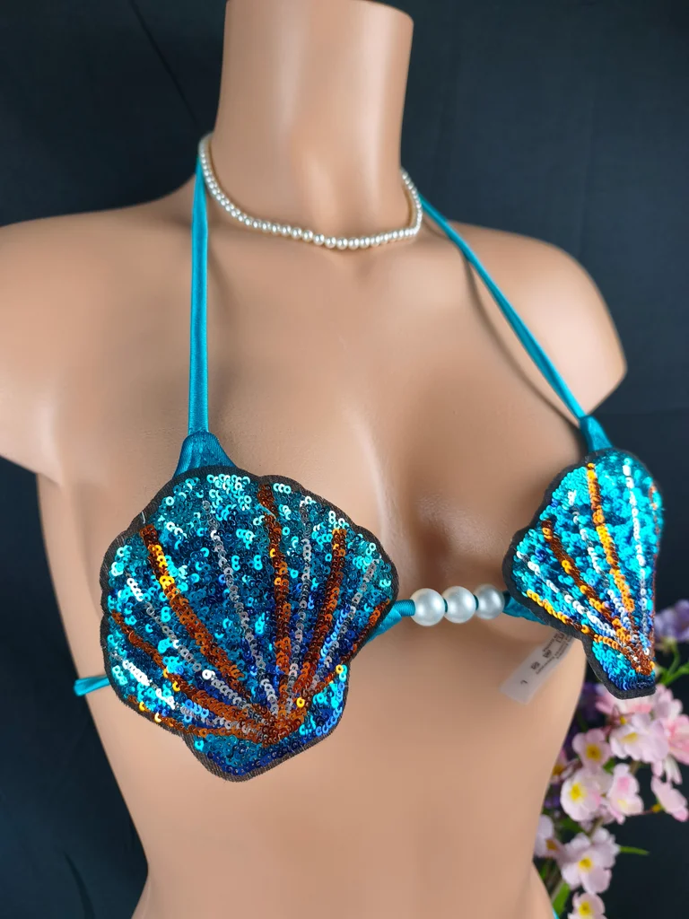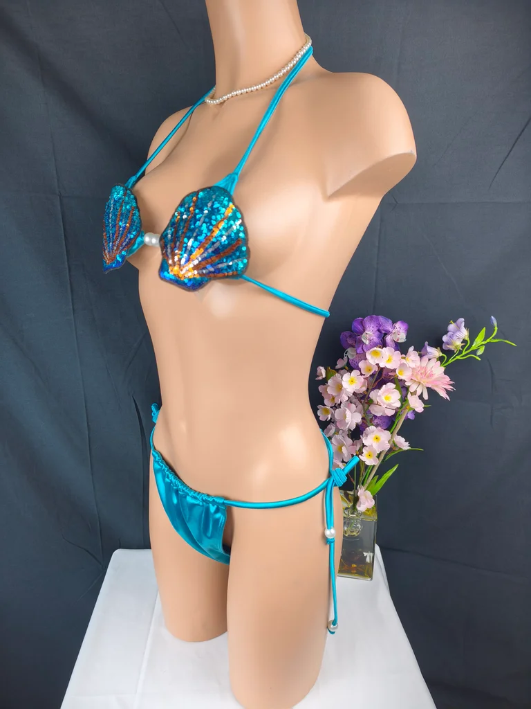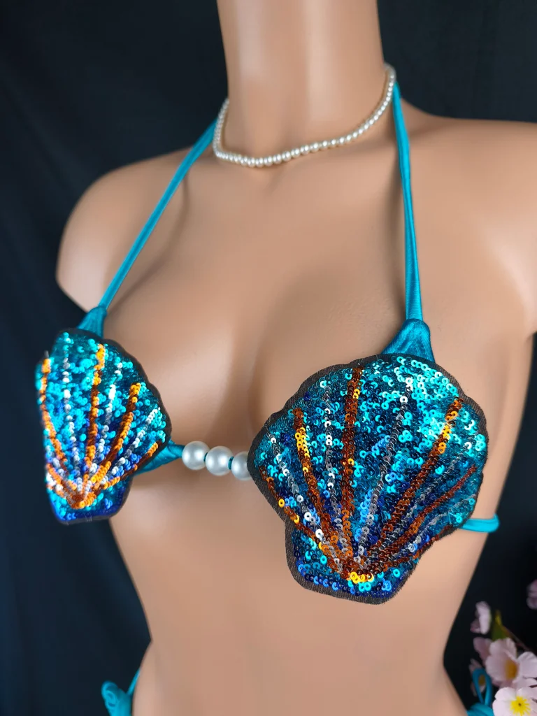 Plongez dans un univers féerique avec ce magnifique bikini inspiré des sirènes, une pièce unique qui ne passera clairement pas inaperçue. Coloris bleu turquoise satiné + haut à sequins multicolores. Haut forme coquillage entièrement recouvert de sequins brillants avec perles décoratives au centre. Bas coupe bikini avec liens à nouer sur les côtés pour un ajustement parfait, orné de perle. Fermeture liens réglables (cou et dos), matière douce, extensible et agréable à porter. Un modèle ultra original et glamour, inspiré des sirènes. Parfait pour un look fantaisie, sexy et estival, idéal pour se démarquer à la plage, en soirée piscine ou événement à thème. Design coquillage unique et très tendance, sequins scintillants qui captent la lumière ! Taille L 40 mais convient à une taille 38. Neuf, jamais porté sous blister, photos conformes à l'article vendu. Livraison rapide et soignée.