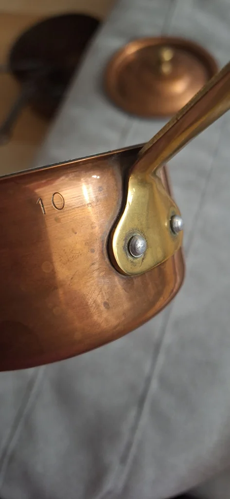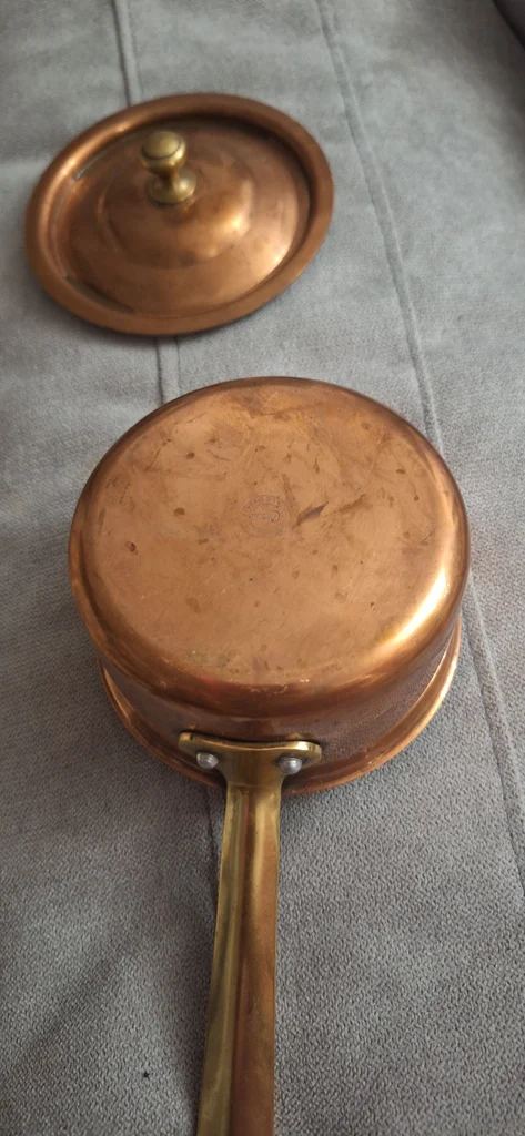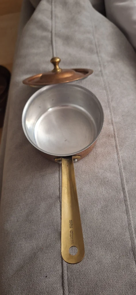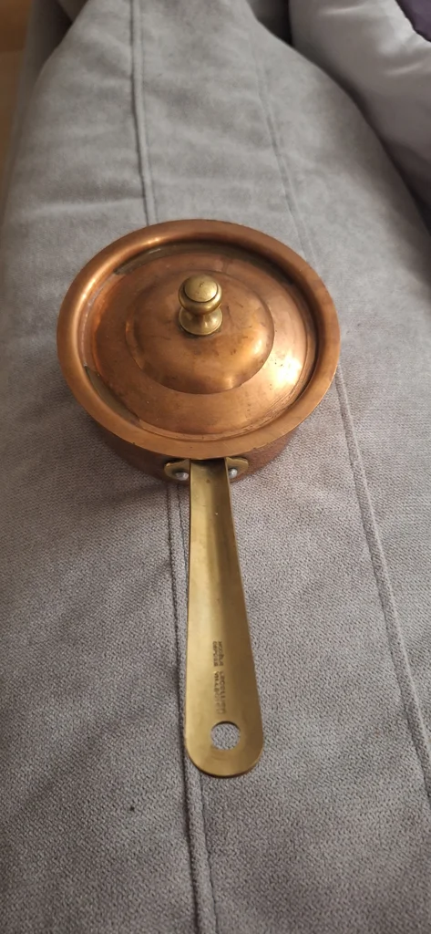 Petite casserole cuivre et fonte avec son couvercle. Casserole numéroté. Très bon état général. Vintage.