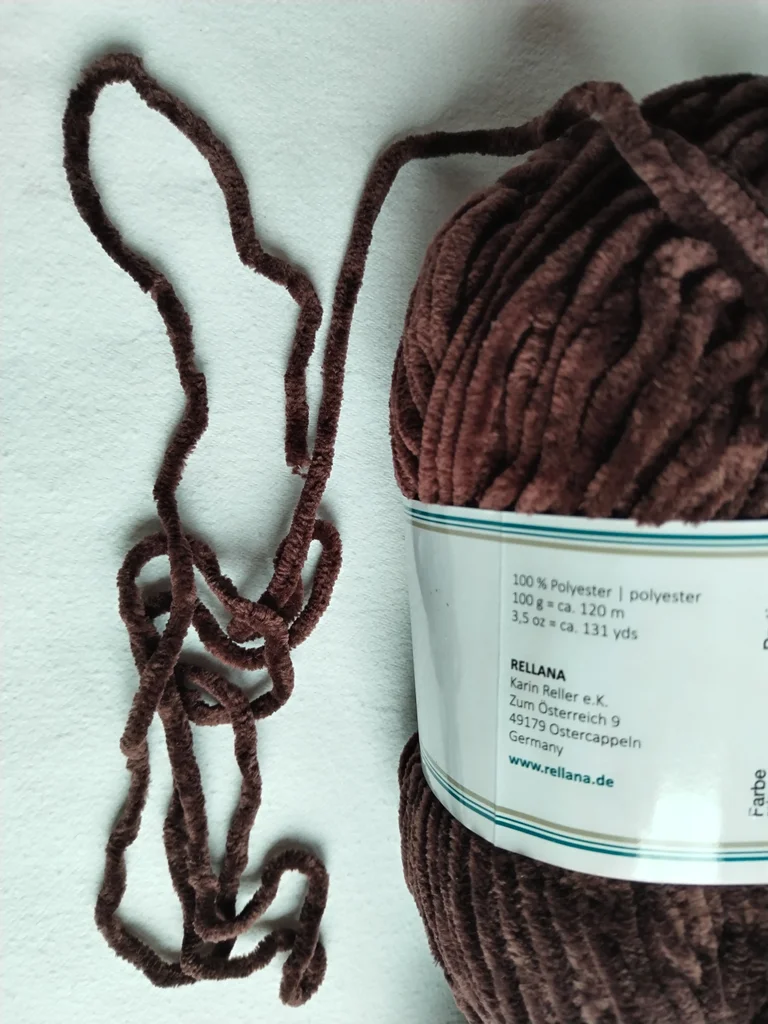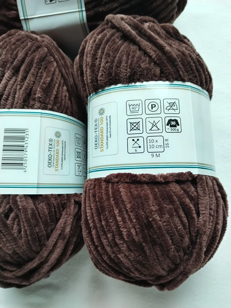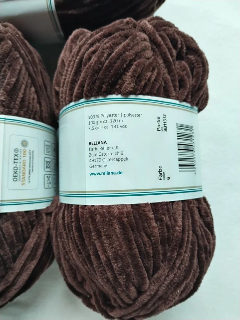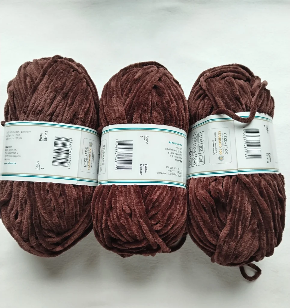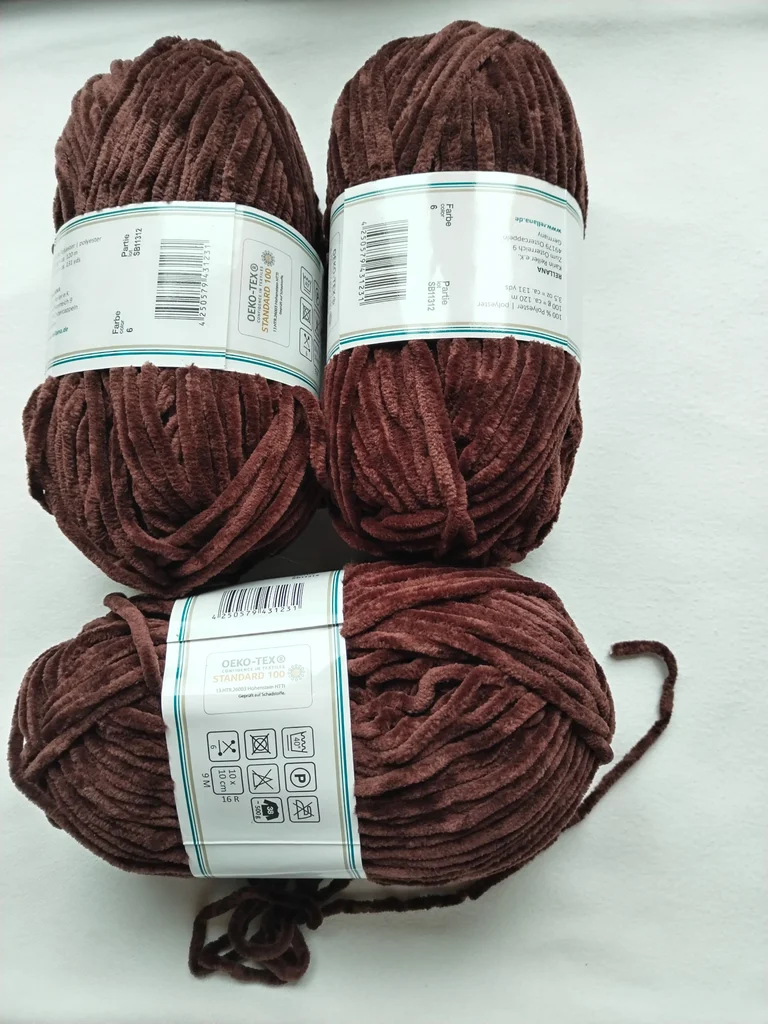 Lot de 3 pelotes de fil chenille - Velours. C'est un fil ultra-doux, type velours, idéal pour réaliser des amigurumis, des couvertures pour bébé ou des accessoires cocooning, des coussins doudous etc Couleur : Marron (Farbe 6) Composition : 100 % Polyester Poids/Métrage : 100g par pelote (soit 300g au total) / env. 120m par pelote Taille d'aiguilles/crochet recommandée : 6 mm Échantillon : 10 x 10 cm = 9 mailles / 16 rangs Certification : OEKO-TEX Standard 100 (garanti sans substances nocives) État : Comme Neuf, jamais utilisé avec étiquettes d'origine (même bain/lot : SB11312) Points forts : Texture extrêmement douce au toucher ("effet peluche"). Entretien facile : lavable en machine à 40°C. Parfait pour les projets rapides grâce à l'épaisseur du fil. 📦 Envoi rapide et soigné. N'hésitez pas si vous avez des questions ! D'autres quantités ou couleurs disponibles 🧶👍