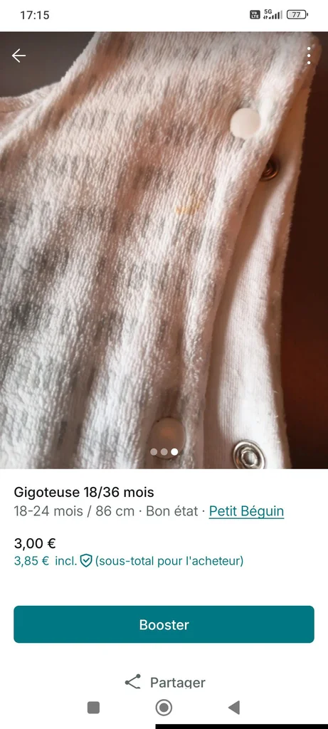 Je vend une gigoteuse taille 18/36 mois en bon état ( juste une tâche qui ne pars pas au lavage ) sinon fermeture nickel 3€ si vous êtes intéressé veuillez me contacter par message