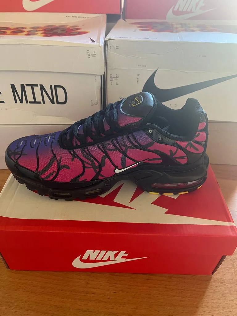 Nike Air Max Plus TN – Black / Purple / Pink / Yellow Pointure : 43.5 Tige mesh dégradé violet/rose/noir Print graphique floral noir signature Swoosh blanc Détails jaunes (languette & Air unit) Semelle noire Air Max visible Boîte Nike originale 📦 NEUF avec boîte ✅ Coloris ultra rare & collector 🔥 TN graphique = pièce qui se remarque 💜🩷