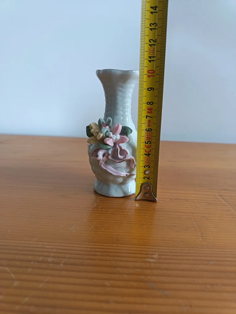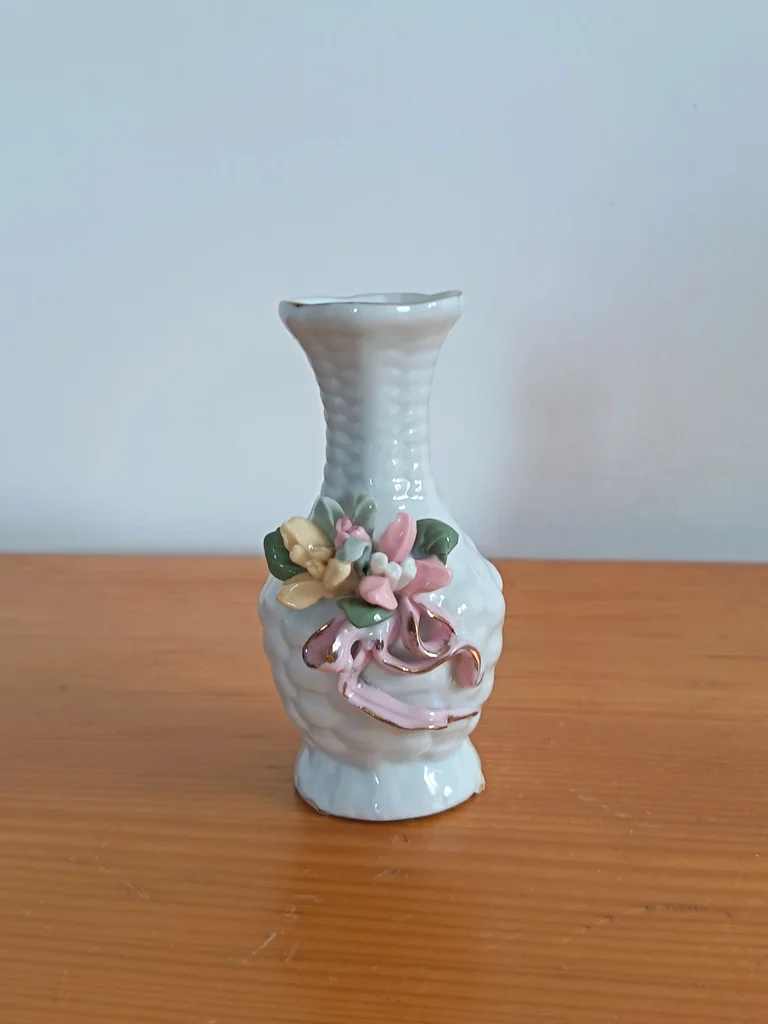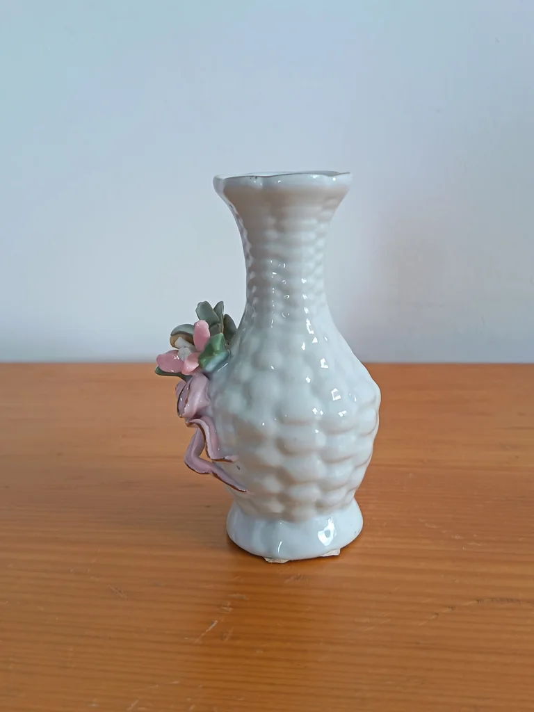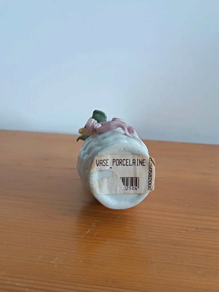 Joli petit vase blanc/gris clair, joliment travaillé et décoré avec un petit bouquet de fleurs aux teintes pastel rose pâle et vert clair, Base ronde, filet doré sur le haut Dimensions : hauteur environ 10,30cm En porcelaine, Très bon état, aucun défaut apparent, juste le filet doré est légèrement effacé J’ai un autre vase dans le même style,