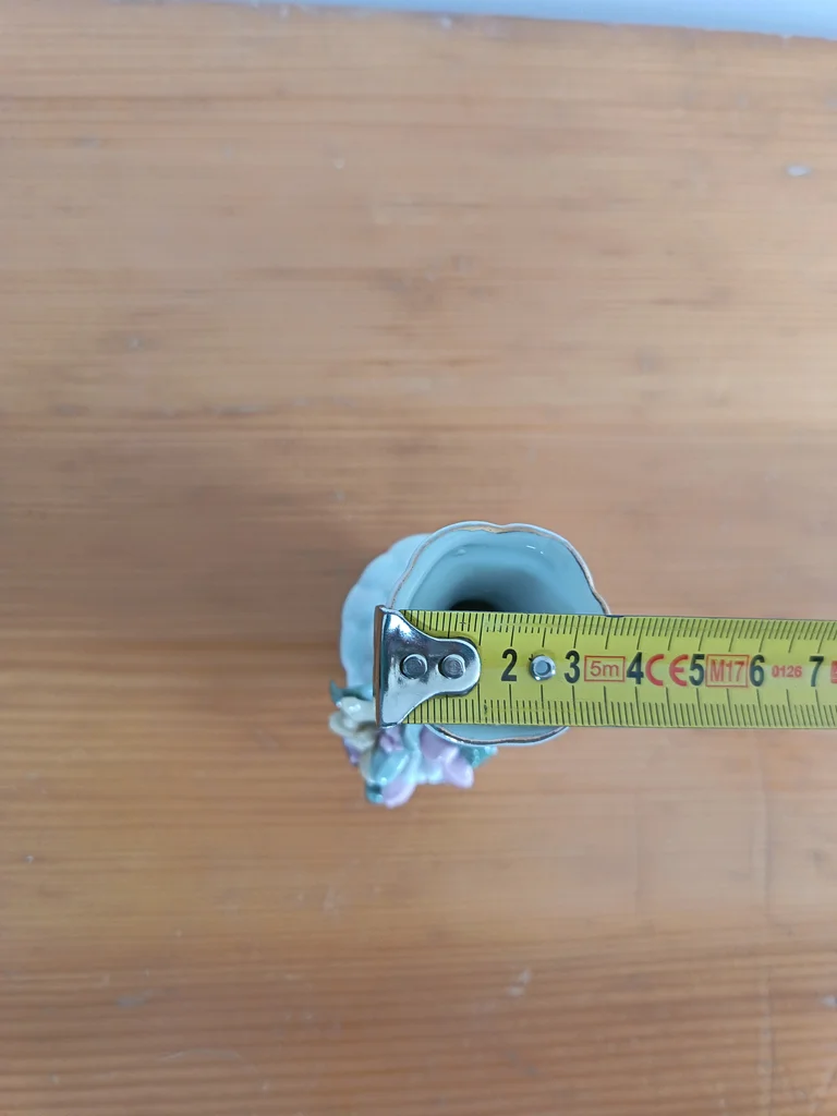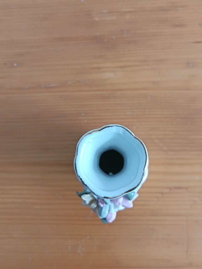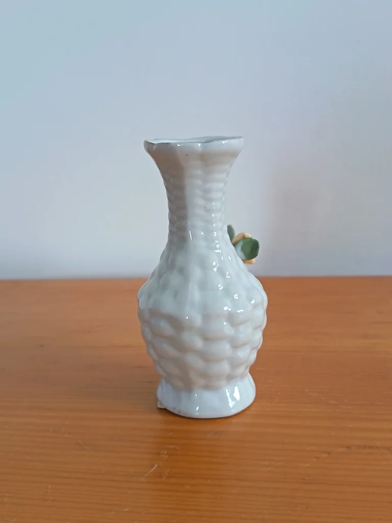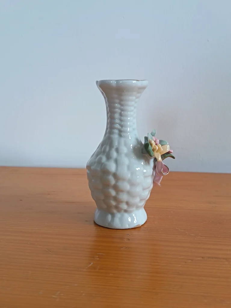 Joli petit vase blanc/gris clair, joliment travaillé et décoré avec un petit bouquet de fleurs aux teintes pastel rose pâle et vert clair, Base ronde, filet doré sur le haut Dimensions : hauteur environ 10,30cm En porcelaine, Très bon état, aucun défaut apparent, juste le filet doré est légèrement effacé J’ai un autre vase dans le même style,